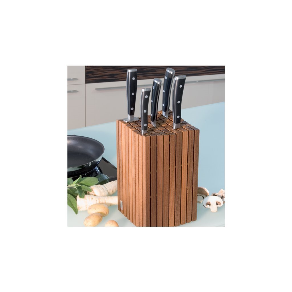Designerski blok na noże WÜSTHOF z pięknego termo-bukowego drewna pochodzi z pracowni projektanta Henninga Gaulke. Noże są chronione przed stępieniem, a równocześnie zawsze pod ręką na blacie kuchennym.