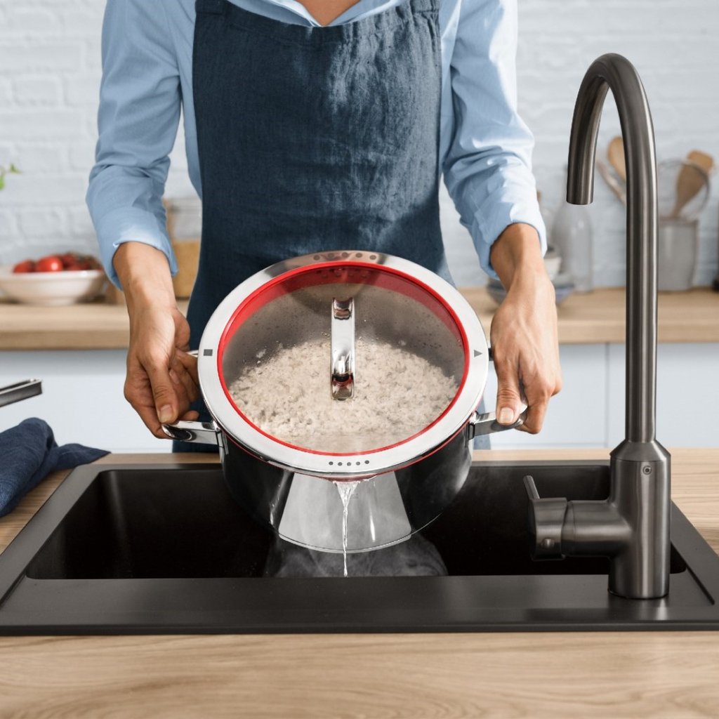Projektanci z NOA Design wyposażyli garnki Function 4 w wyjątkowe pokrywki. Te wytrzymałe szklane pokrywy z uchwytami ze stali nierdzewnej są wystarczająco duże do łatwego oglądania zawartości garnków oraz silikonowy pierścień amortyzujący uderzenia. Ich dodatkową zaletą jest funkcja kontrolowanego wylewania bez użycia durszlaka, co oszczędza czas i naczynia. Symbole zaznaczone na górnej części pokrywy wskazują, jak ustawić pokrywę do gotowania z małą ilością wody, do odcedzania ziemniaków, makaronu, ryżu lub do szybkiego wylewania zawartości.