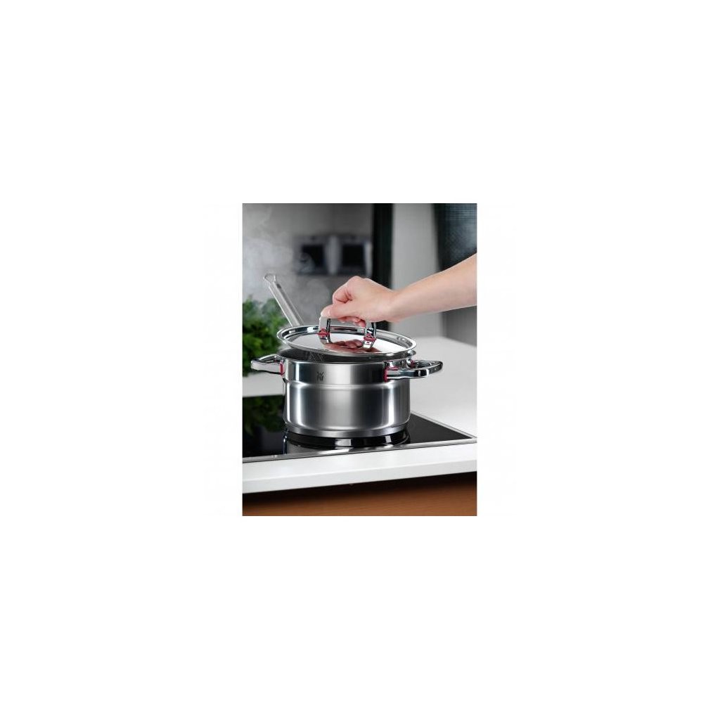 Dzięki opatentowanej funkcji Cool+® uchwyty przykrywek ze stali nierdzewnej nie nagrzewają się podczas gotowania. Miłym szczegółem jest otwór w pokrywie, który pozwala na kontrolowane wydostawanie się pary z garnka podczas gotowania. Pokrywa nie odskakuje, a woda nie wylewa się. Dzięki wytrzymałemu Materiałowi Premium One może być używany również do pieczenia w piekarniku. W tym przypadku konieczne jest używanie rękawic kuchennych do pracy z gorącymi naczyniami.