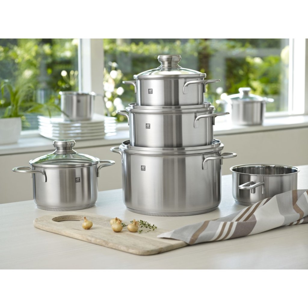 Seria TWIN® Nova została zaprojektowana w prostym, klasycznym stylu, który pasuje do większości kuchni. Gotowanie z tak wysokiej jakości, uniwersalnymi i wysoce funkcjonalnymi naczyniami będzie dla Ciebie przyjemnością. Garnki mają jasną, satynowo-gładką powierzchnię, charakterystyczną dla garnków ZWILLING J. A. Henckels. Nieskomplikowane i uniwersalne, naczynia o okrągłym kształcie są idealnym partnerem dla nowoczesnego, zdrowego gotowania.