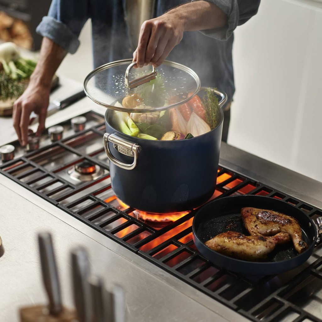 - Solidny korpus z litej aluminium zapewnia równomierne rozprowadzanie ciepła po całej powierzchni i stabilną wydajność podczas codziennego gotowania.