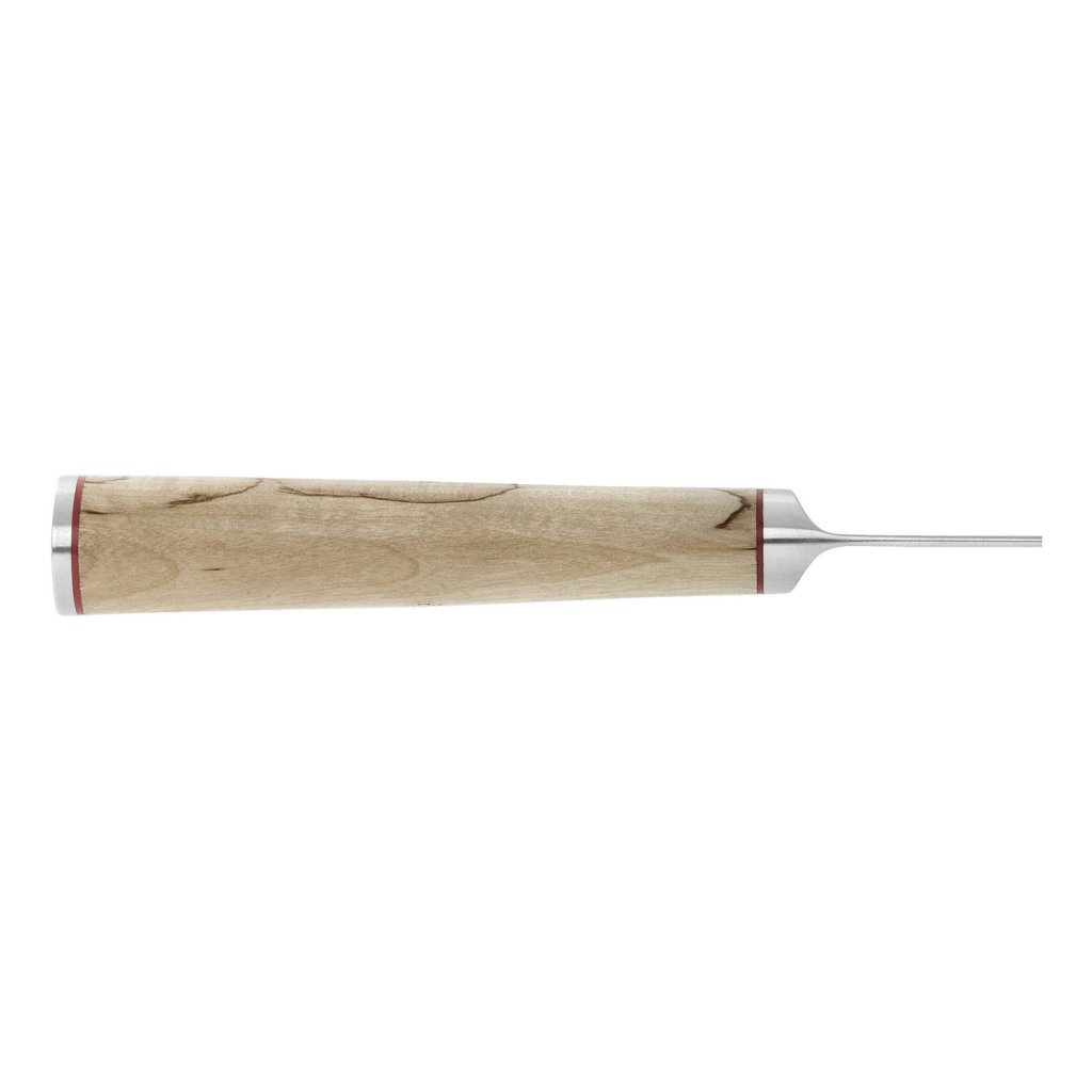 Niezwykle ostry japoński nóż SUJIHIKI o smukłym długim ostrzu znakomicie nadaje się do krojenia delikatnego mięsa . Niska wysokość ostrza zmniejsza tarcie i nóż łatwiej przenika mięso. Jeśli pracowałeś już europejskimi nożami, będziesz zaskoczony niezwykłą delikatnością ostrza. SUJIHIKI to japońska wersja zachodniego noża do filetowania. Bez większego wysiłku kroi surowe mięso i ryby na cienkie plasterki. Niezrównaną geometrię noża docenisz również podczas porcjowaniu pieczeni, szynki czy piersi drobiowych. Jeśli jesteś miłośnikiem wołowego carpaccio, ten nóż powinien stać się obowiązkowym elementem wyposażenia Twojej kuchni. Wygodna, doskonale wyważona rękojeść brzozowa w kształcie litery "D" doskonale leży w dłoni.