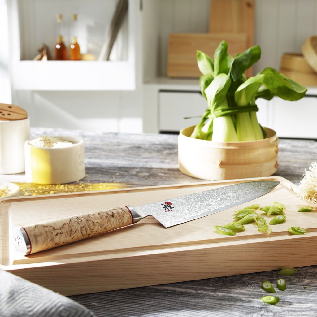 Seria noży MIYABI 5000MCD łączy w sobie doskonałą funkcjonalność, ergonomię i niepowtarzalny design. Każdy pojedynczy nóż jest wynikiem autentycznego rzemiosła z "miasta noży" Seki. Tradycyjne rzemiosło i nowoczesna technologia zaowocowały najwyższą możliwą jakością wśród noży produkowanych komercyjnie. Niezwykle twardy rdzeń ze stali proszkowej Micro Carbide MC63 jest zamknięty w 100 warstwach stali o dwóch różnych twardościach. Specjalne wykończenie ostrza nadaje mu warstwową fakturę, nadając każdemu nożowi oryginalny. niepowtarzalny damasceński wzór kwiatowy. Aby uzyskać jeszcze lepsze właściwości stali, zastosowano unikalny proces hartowania CRYODUR®, podczas którego jest ona mrożona w temperaturze -196°C. Uzyskany w ten sposób materiał charakteryzuje się ekstremalną twardością 63 w skali Rockwella. Nóż jest symetrycznie ręcznie szlifowany w kształt litery "V" pod kątem 19°. Tradycyjne ręczne ostrzenie Honbazuke sprawdzane było setki lat przez mistrzów produkcji noży. Jest to wieloetapowy proces szlifowania, w którym nóż jest najpierw ostrzony za pomocą pionowego i poziomego obrotowego kamienia szlifierskiego, a na koniec ostrze jest polerowane skórzanym pasem do honowania. Dzięki klinowej krawędzi tnącej, ostrze z łatwością przenika przez produkty spożywcze. Klasyczna rękojeść w kształcie litery "D" wykonana jest z brzozy Masur. Tekstura i usłojenie drewna sprawia, że każda sztuka jest oryginalna. Zastosowany materiał doskonale symbolizuje japoński szacunek do natury. Wyrafinowana dekoracja uchwytu tkwi w detalach w stylu azjatyckim - podstawa ze stali nierdzewnej z logo, dekoracyjny element o mozaikowej fakturze i czerwona linia przynoszą silne wrażenia estetyczne.