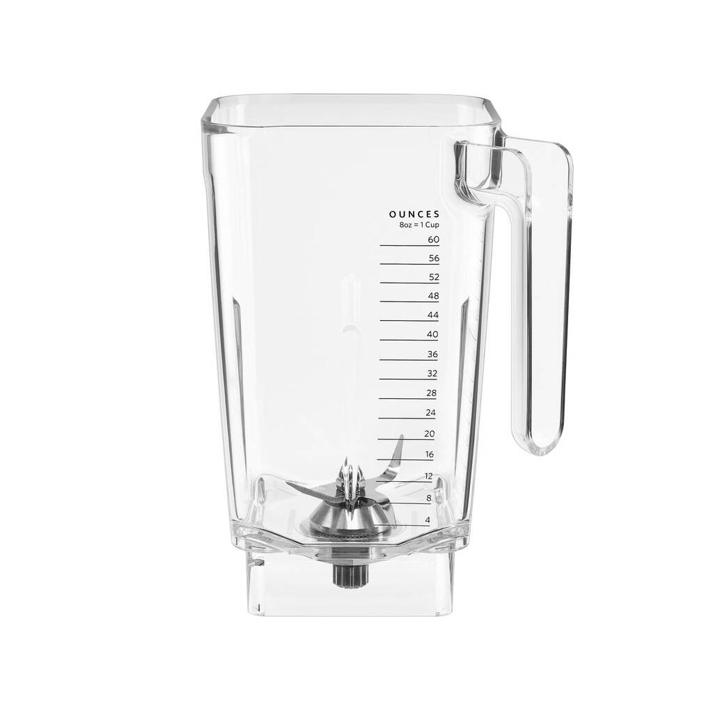 Kielich z tworzywa sztucznego wolnego od BPA ma zaznaczoną skalę pomiarową i ścięte rogi dla czystego nalewania z trzech stron. Pojemnik zawiera również silikonową pokrywę z bezpiecznym zamknięciem oraz wolną od BPA miarkę do odmierzania i dodawania składników podczas miksowania. Zaletą jest również poręczny popychacz, który pomaga przy mieszaniu bardzo gęstych składników. Dzięki niemu składniki można wepchnąć bezpośrednio w wir miksujący i w ten sposób zblendować na naprawdę gładką masę. Docenisz również wyjmowaną silikonową podkładkę dla maksymalnej stabilności.