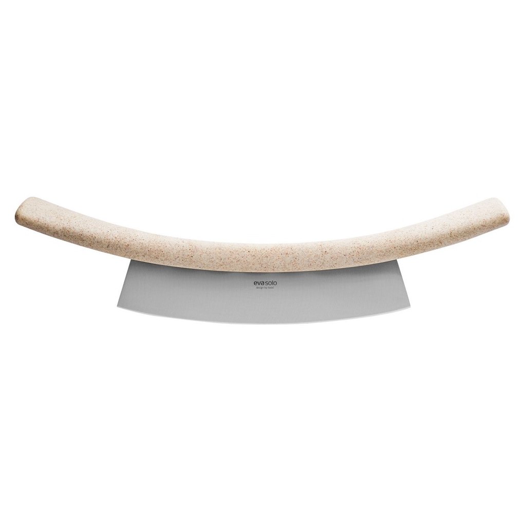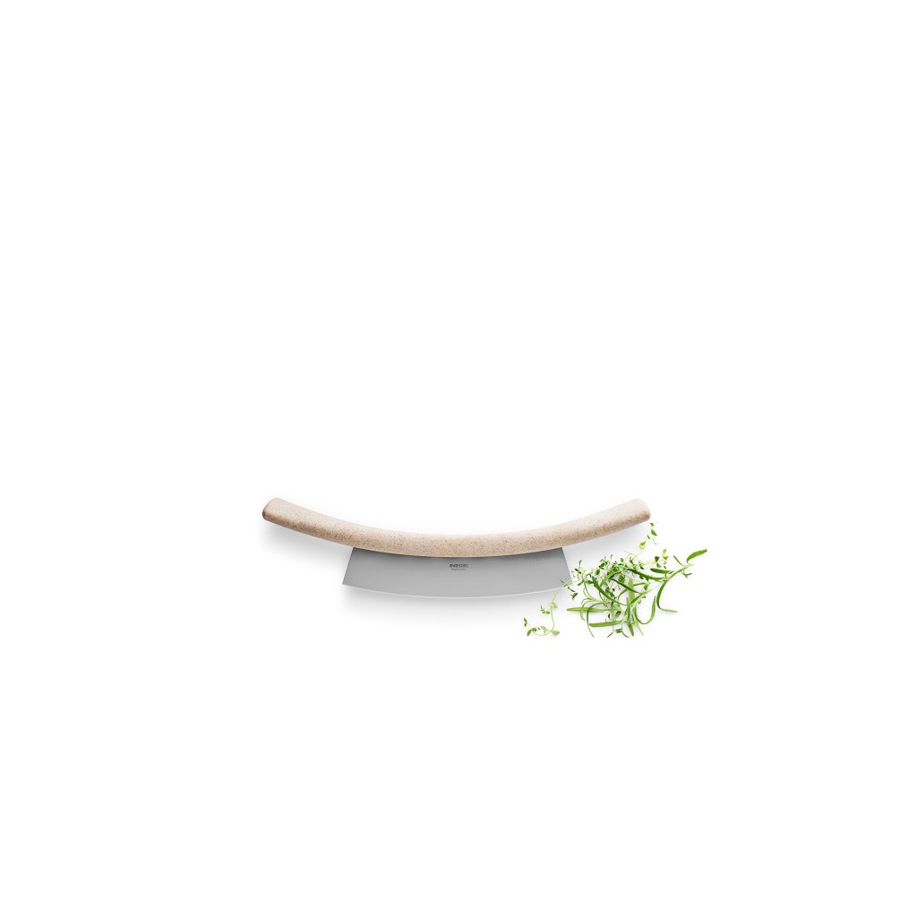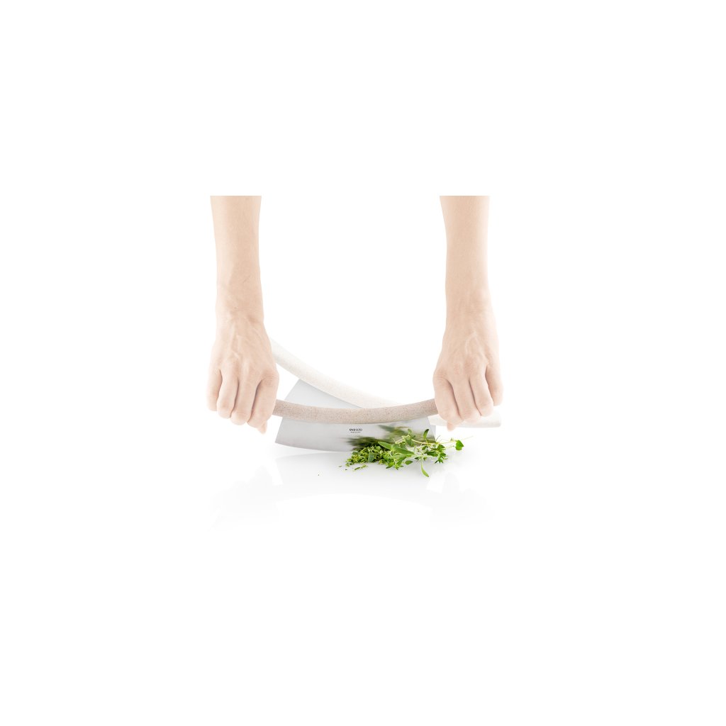 Ta funkcjonalny nóż kołyskowy Eva Solo ułatwia siekanie warzyw i ziół. Wystarczy kołysać się zakrzywionym ostrzem po składnikach. Nóż kołyskowy posiada mocny i wygodny uchwyt na każdym końcu. Mniej plastiku, więcej smaku w kuchni. Seria Green tools to gama funkcjonalnych przyborów kuchennych i naczyń zaprojektowanych tak, aby podkreślić smak serwowanych potraw.