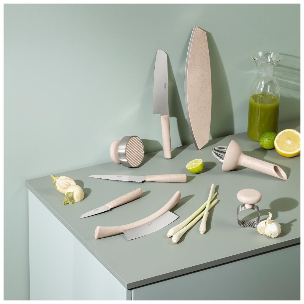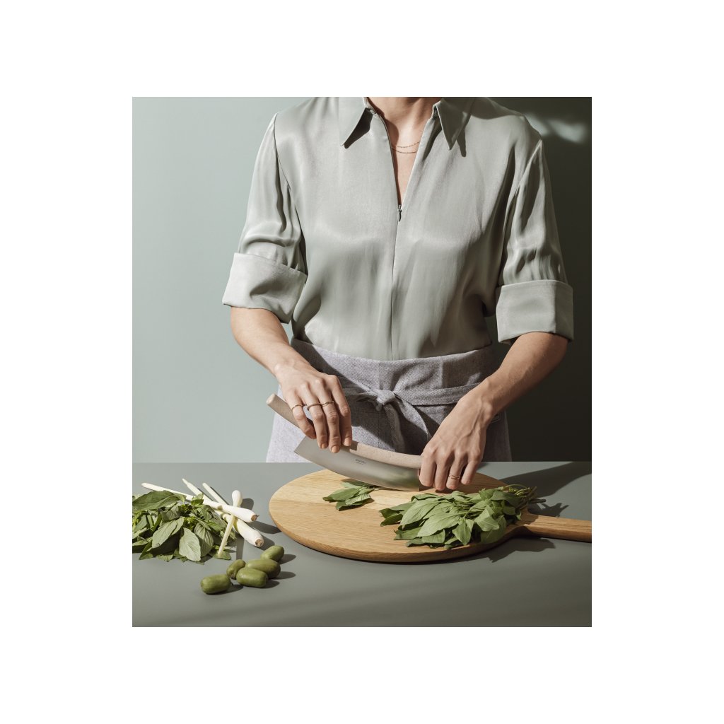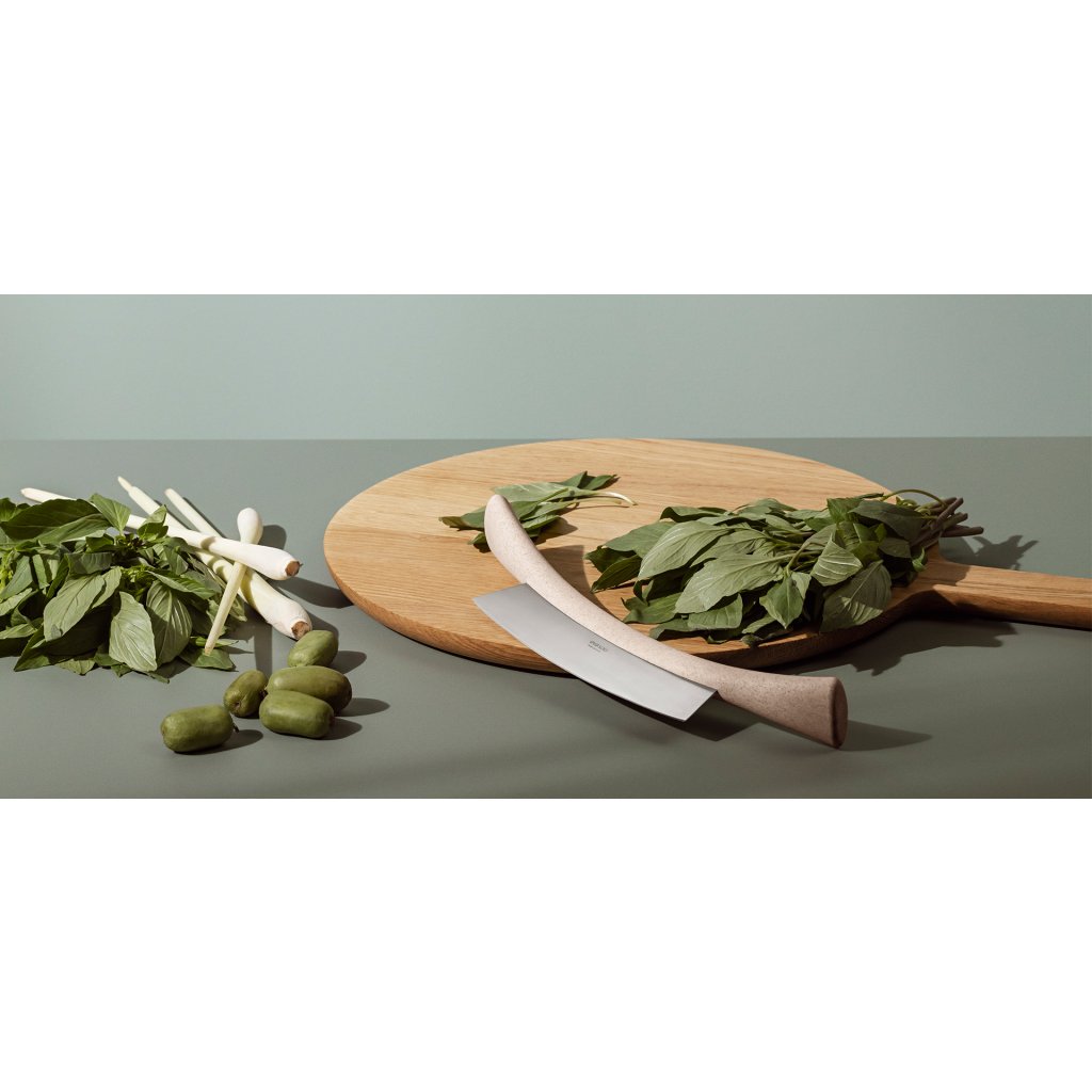 Ta funkcjonalny nóż kołyskowy Eva Solo ułatwia siekanie warzyw i ziół. Wystarczy kołysać się zakrzywionym ostrzem po składnikach. Nóż kołyskowy posiada mocny i wygodny uchwyt na każdym końcu. Mniej plastiku, więcej smaku w kuchni. Seria Green tools to gama funkcjonalnych przyborów kuchennych i naczyń zaprojektowanych tak, aby podkreślić smak serwowanych potraw.