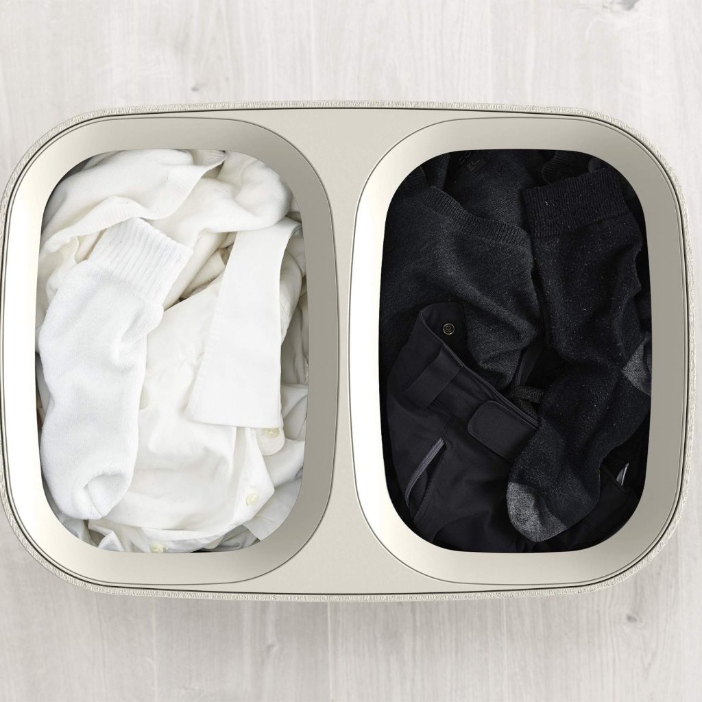 - Dwie oddzielne przegrody o pojemności 45 litrów umożliwiają łatwe oddzielenie jasnego, ciemnego i kolorowego prania już podczas jego przechowywania.
