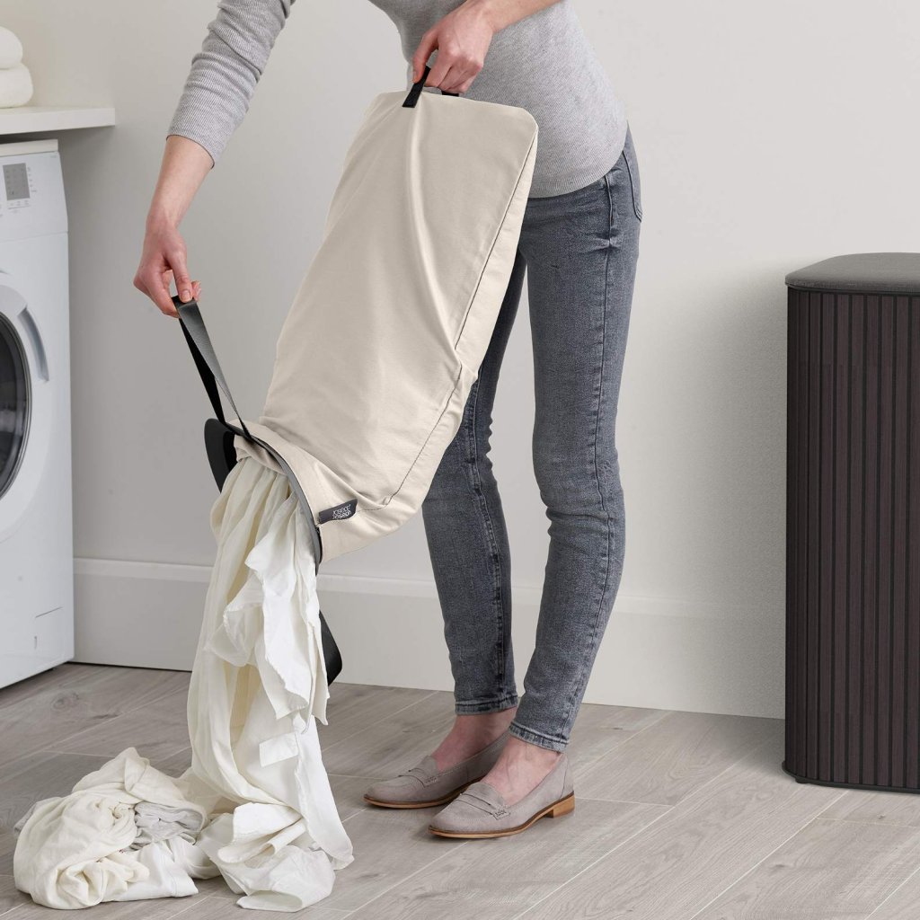 - Wyjmowane torby tekstylne z mocnymi uchwytami umożliwiają wygodne przenoszenie prania bezpośrednio do pralki bez konieczności przenoszenia całego kosza.