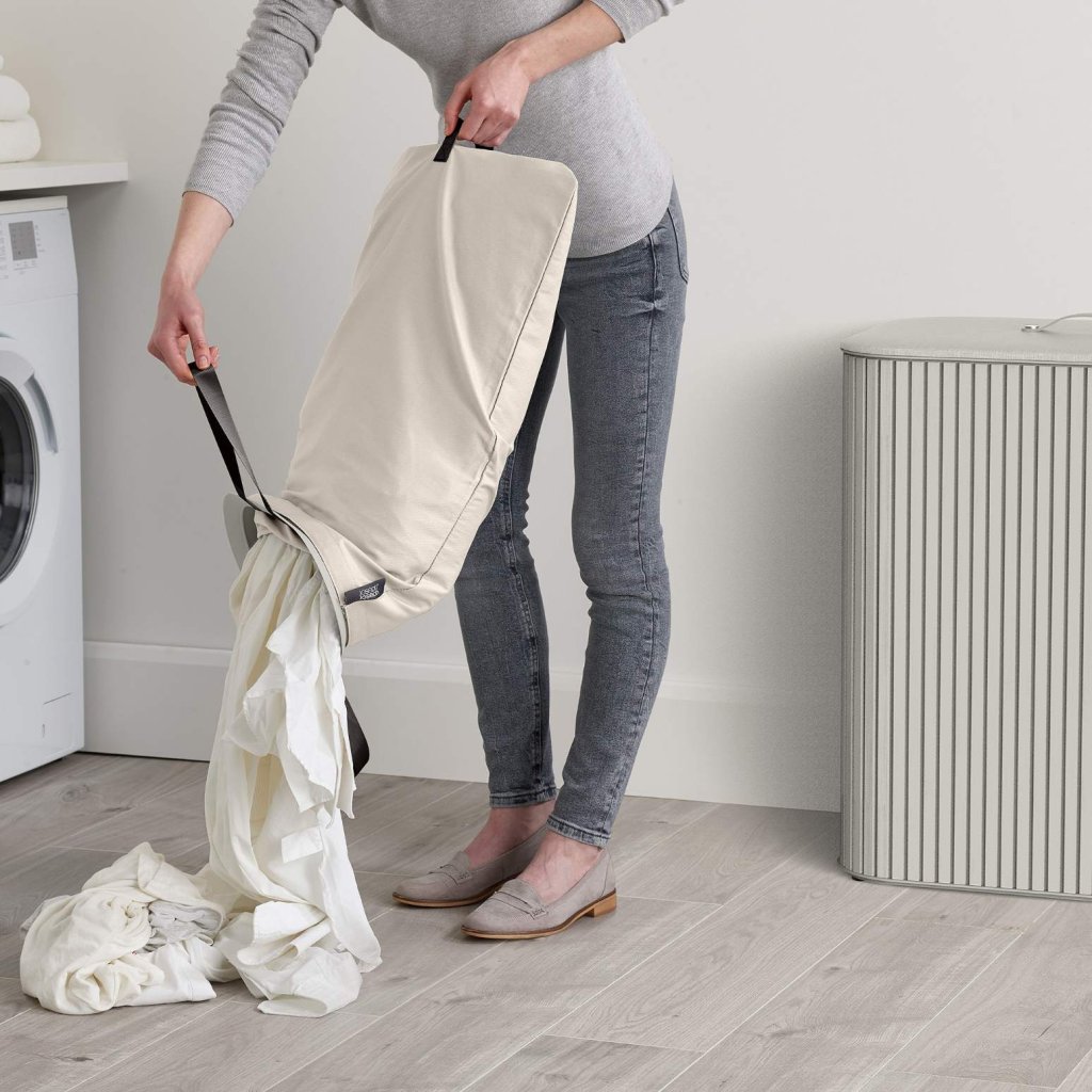 - Wyjmowane torby tekstylne z mocnymi uchwytami umożliwiają wygodne przenoszenie prania bezpośrednio do pralki bez konieczności przenoszenia całego kosza.