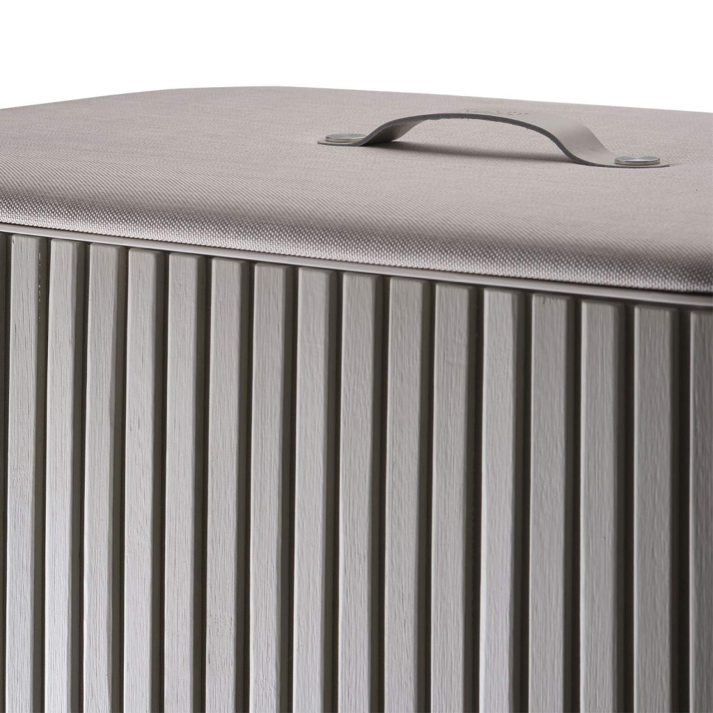 - Pokrywa pokryta tkaniną jest wyposażona w skórzany uchwyt, który ułatwia obsługę i jednocześnie podkreśla jej wyrafinowany design.