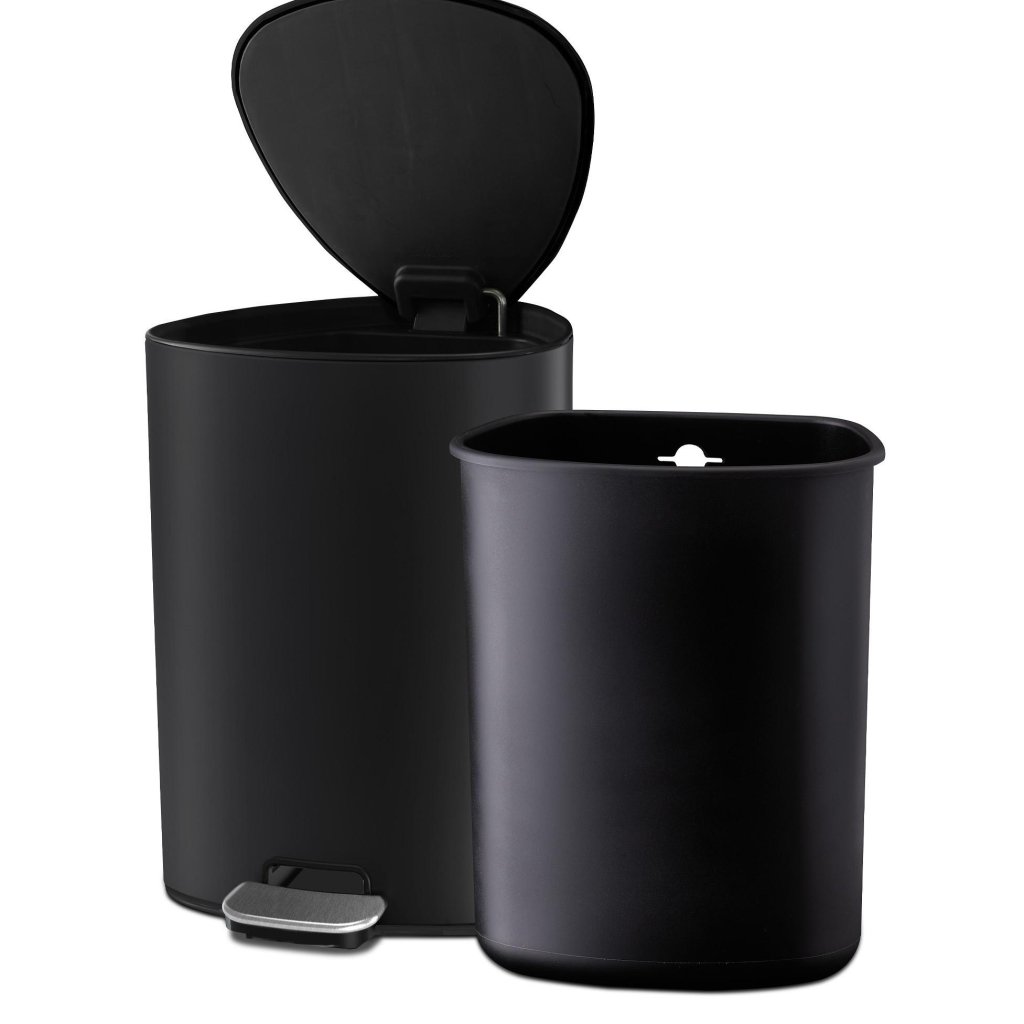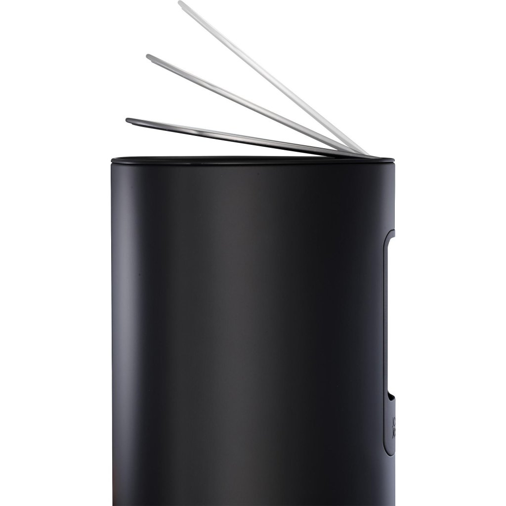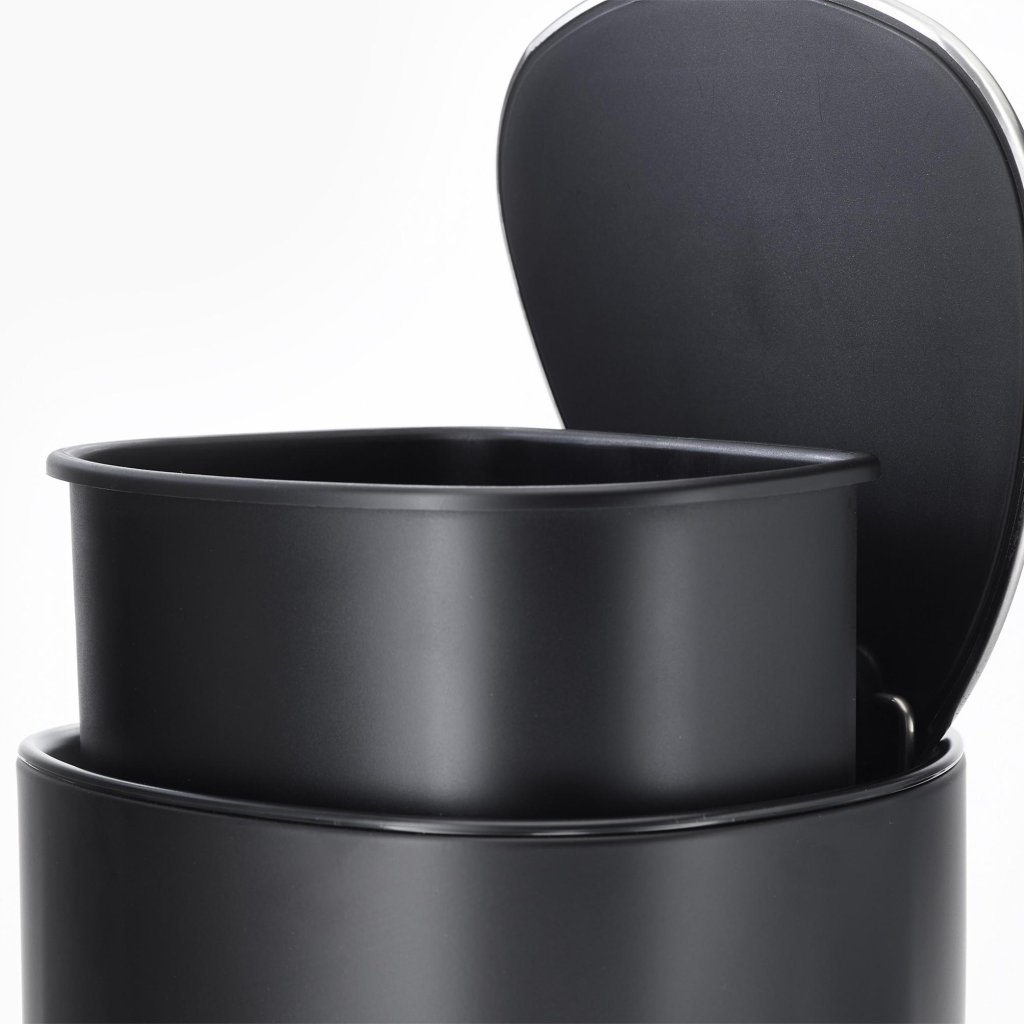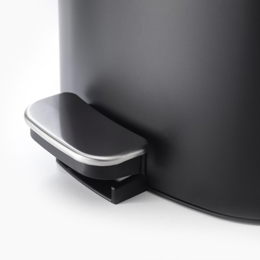 - Korpus kosza wykonany jest z wytrzymałej stali z matowym czarnym wykończeniem i uzupełniony o pokrywę i pedał ze stali nierdzewnej z cichym domykaniem.