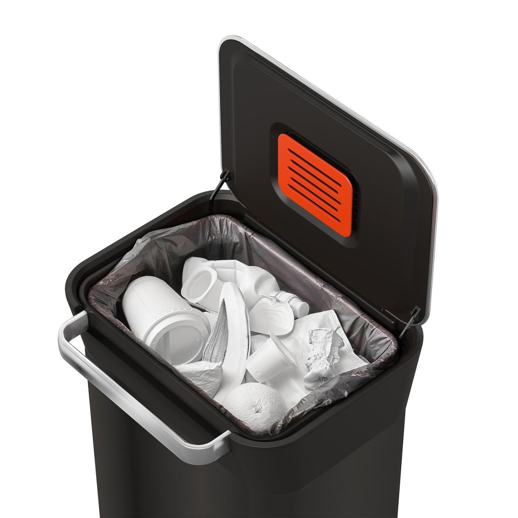 - Zintegrowany mechanizm kompresji pozwala na zgniatanie odpadów bezpośrednio wewnątrz kosza, dzięki czemu pomieści on do 3 razy więcej odpadów niż zwykłe kosze o podobnej wielkości.