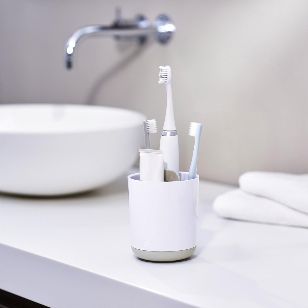 - Stojak na szczoteczki Joseph Joseph DUO w białym kolorze to praktyczne i higieniczne rozwiązanie do codziennej organizacji akcesoriów łazienkowych.