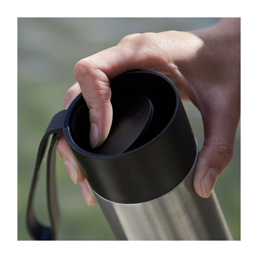 Kubek termiczny ze stali nierdzewnej To Go marki Eva Solo o podwójnych ściankach doskonale izoluje i utrzymuje Twój napój w odpowiedniej temperaturze do 5-6 godzin. Doskonale się zamyka i nadaje się do noszenia w torebce, plecaku, do przypięcia do roweru lub do samochodu. Dzięki praktycznemu silikonowemu paskowi na plastikowej nakrętce w kolorze jasnoniebieskim, można ją również łatwo nosić w dłoni.