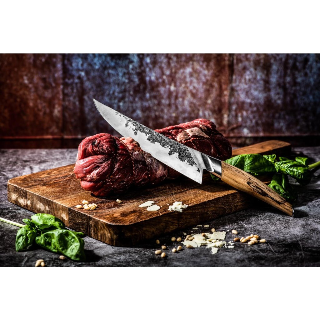 Dzięki temu uniwersalnemu nożowi szefa kuchni o długości ostrza 20,5 cm można wygodnie kroić w plastry, siekać i kroić w kostkę warzywa, mięso, grzyby i wiele innych.