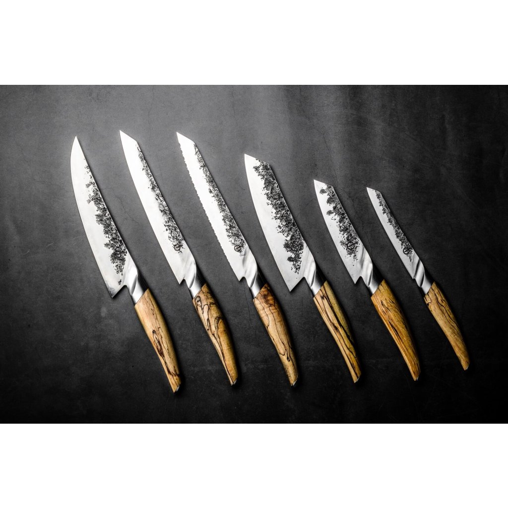 Holenderska marka Forged charakteryzuje się wyjątkowymi, fantazyjnymi nożami, które wykonywane są ręcznie z japońskiej stali. Są to produkty unikalne i wysokiej jakości, nie tylko w zakresie Materiałów, ale również wykonania. Noże są również pakowane w piękne pudełka upominkowe z palonego drewna. Wspaniały pomocnik i akcesorium do projektowania kuchni domowych i profesjonalnych.