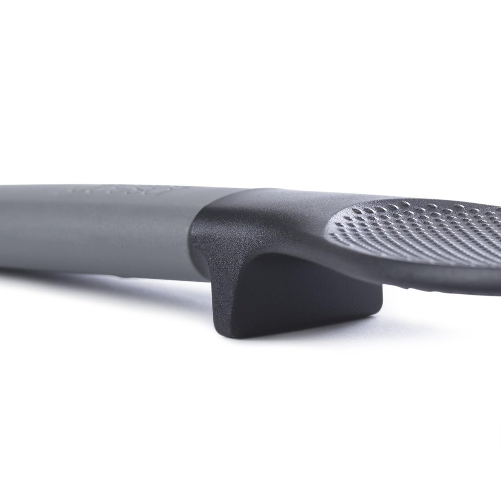 - Zintegrowana podpórka w rączce pomaga utrzymać główkę łyżki z dala od powierzchni roboczej, przyczyniając się do czystszej i bardziej higienicznej kuchni.
