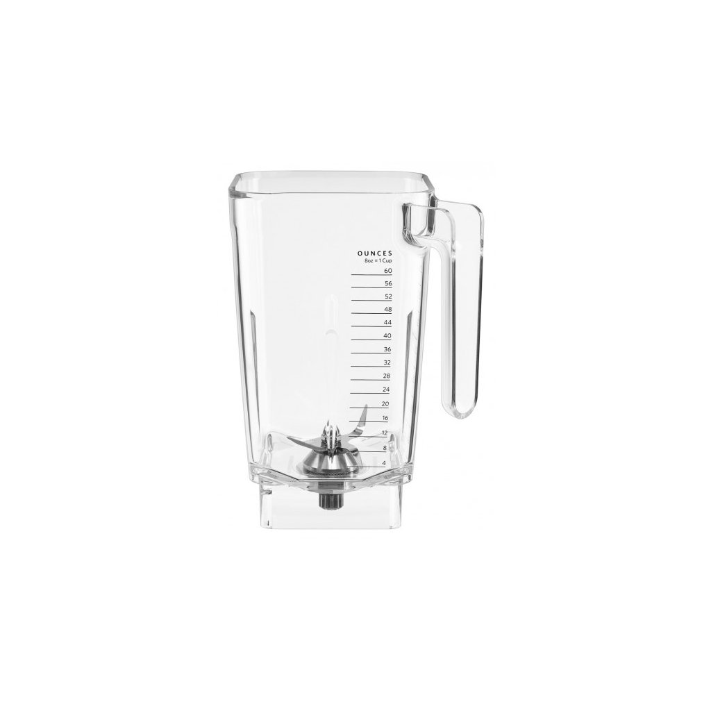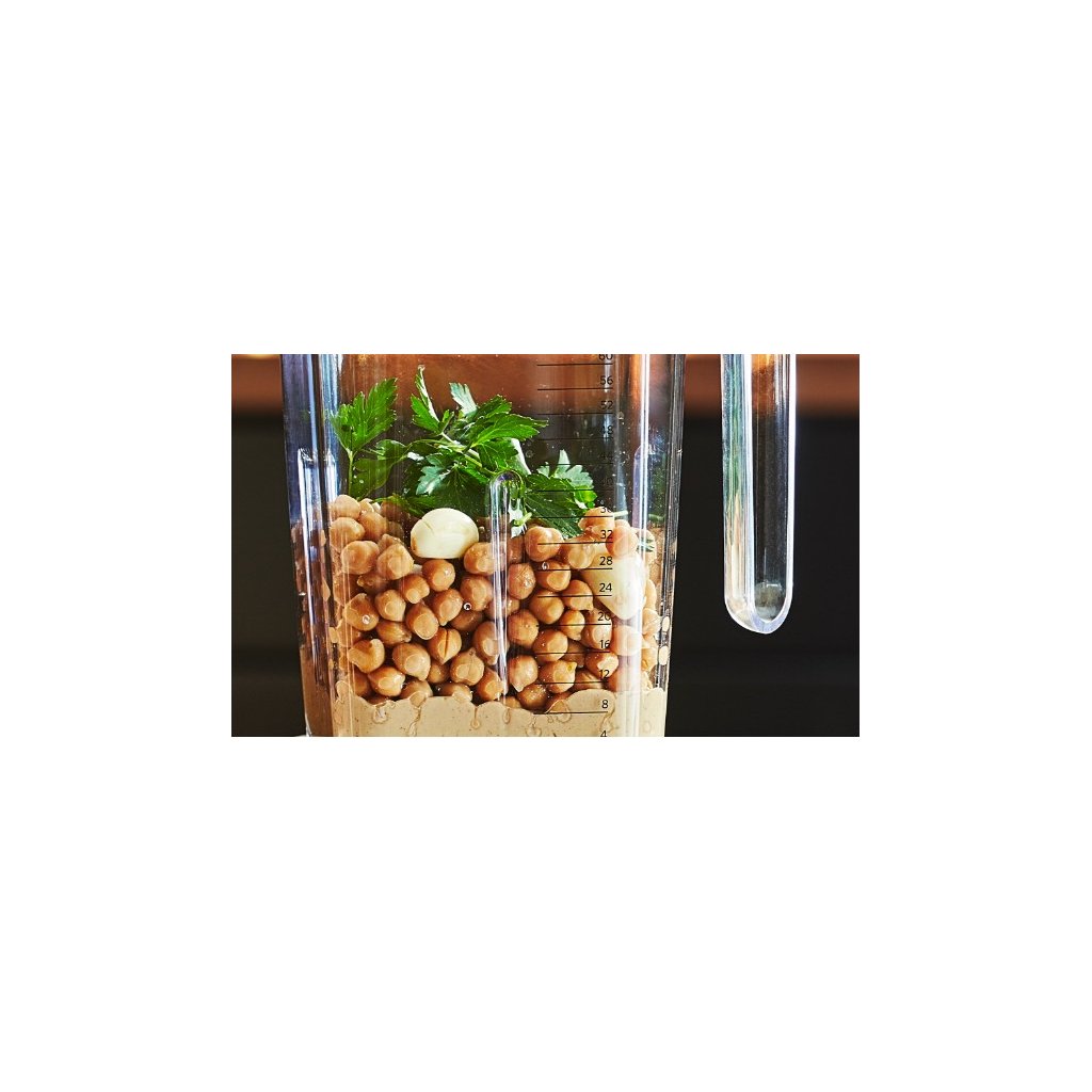 Kielich z tworzywa sztucznego wolnego od BPA ma zaznaczoną skalę pomiarową i ścięte rogi dla czystego nalewania z trzech stron. Pojemnik zawiera również silikonową pokrywę z bezpiecznym zamknięciem oraz wolną od BPA miarkę do odmierzania i dodawania składników podczas miksowania. Zaletą jest również poręczny popychacz, który pomaga przy mieszaniu bardzo gęstych składników. Dzięki niemu składniki można wepchnąć bezpośrednio w wir miksujący i w ten sposób zblendować na naprawdę gładką masę. Docenisz również wyjmowaną silikonową podkładkę dla maksymalnej stabilności.
