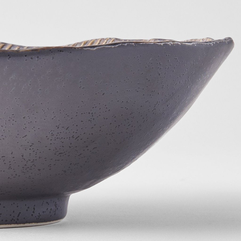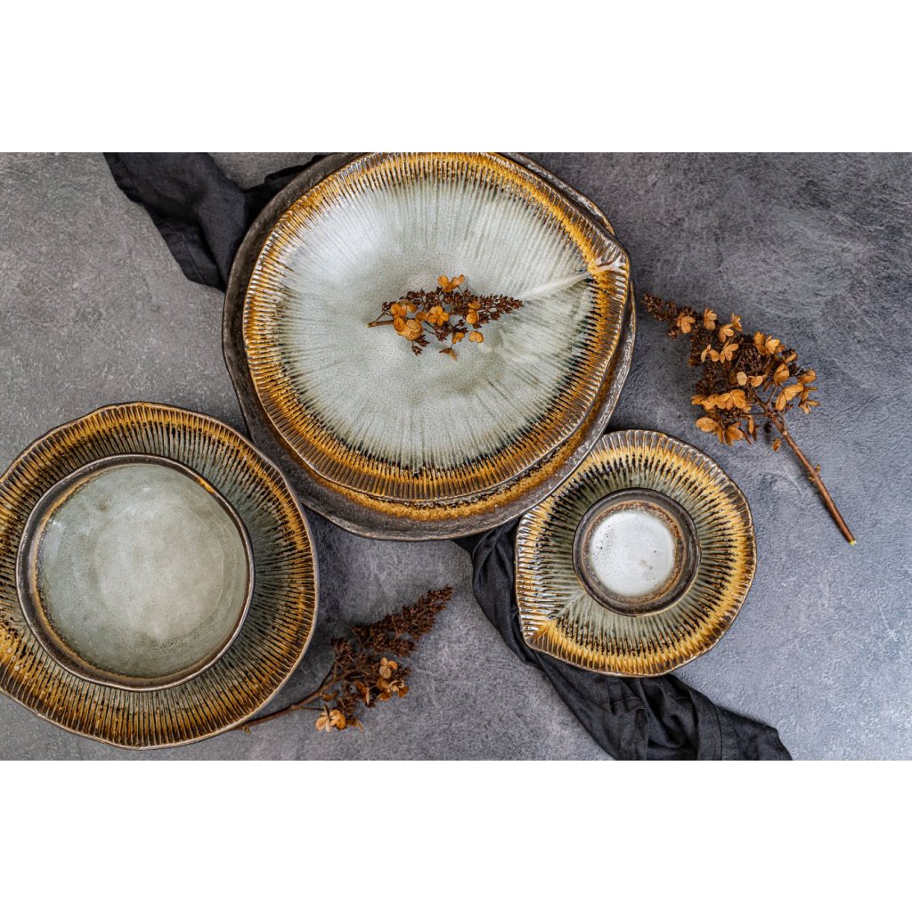 W tym pakiecie znajdziesz bardzo ciekawą asymetryczną misę z nieregularnym rantem z kolekcji Akane Grey, średnica 24/22 cm. Błyszcząca misa z popękaną glazurą ma szary kolor, żółte linie i brązowe krawędzie.