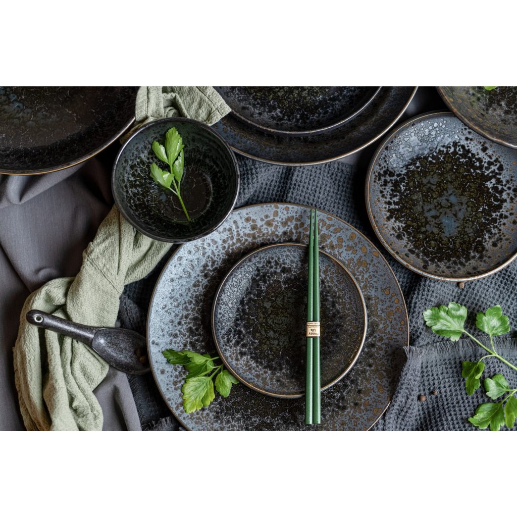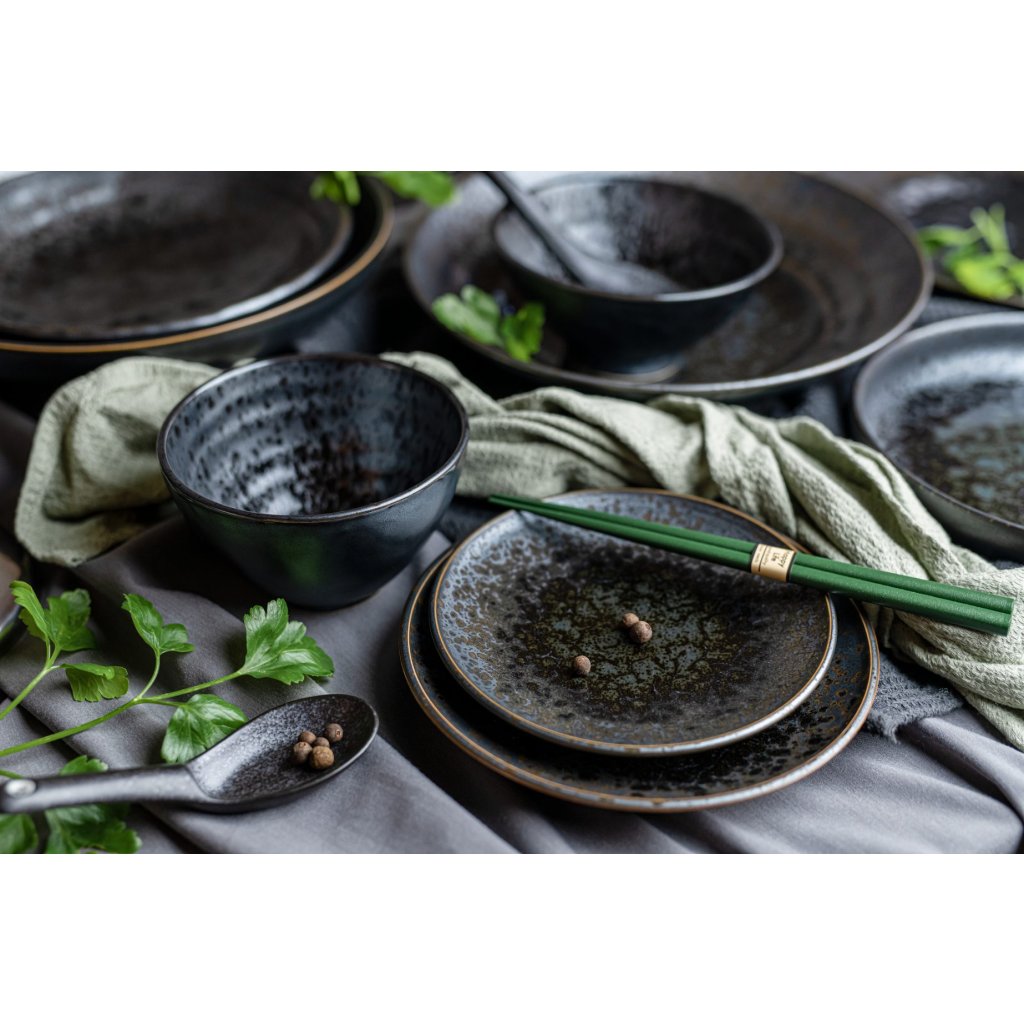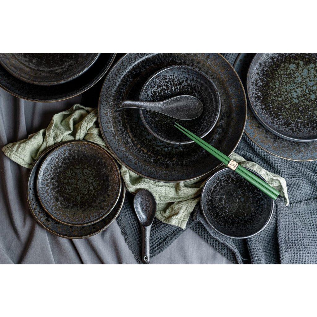 Naczynia z kolekcji Black Pearl są bardzo interesujące dzięki efektowi rozprysku na czarnej podstawie przypominającej metal. Jest on obrzeżony cienką brązową linią, która doskonale uzupełnia szaro-czarną kolorystykę naczyń. Na pierwszy rzut oka wygląda na ziarnisty, ale w rzeczywistości naczynia są gładkie i błyszczące.