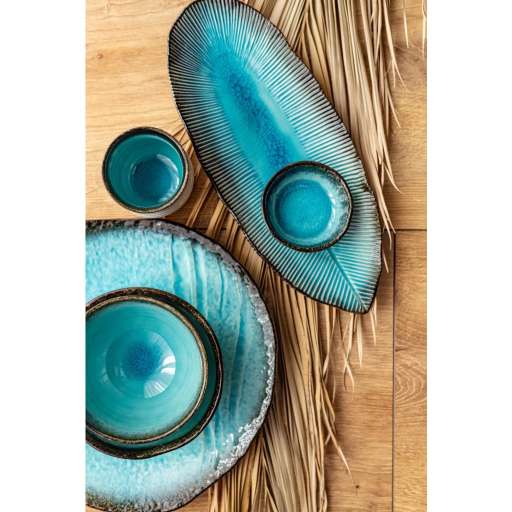 Naczynia z kolekcji Sky Blue przeniosą Cię nad morze. Jego głęboki turkusowy kolor przywołuje na myśl czyste, przejrzyste morze, a brązowa krawędź przypomina wybrzeże. Naczynia z tej kolekcji mają błyszczącą powierzchnię z popękaną glazurą. Nieregularna krawędź wskazuje na ręczną robotę.