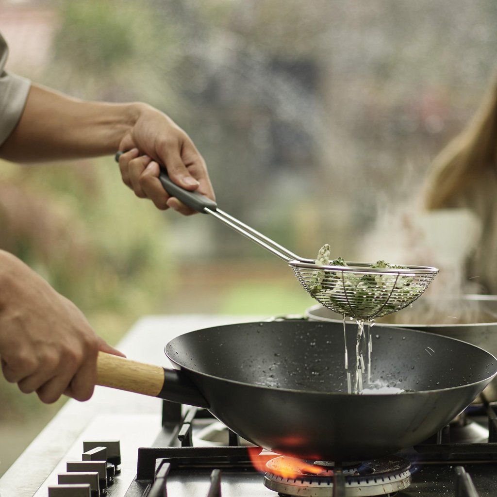 Nie każda kuchnia dysponuje miejscem na cały arsenał naczyń, który doceniłby profesjonalny szef kuchni. Czasami jednak chcesz wymieszać, przewrócić i wyjąć składniki z patelni, jak w dobrej azjatyckiej restauracji. Trzy narzędzia w jednym zestawie wystarczą, aby poradzić sobie ze wszystkimi najważniejszymi czynnościami, a po ugotowaniu można je złożyć na tyle ekonomicznie, że nie zajmują więcej miejsca niż zwykłe narzędzia kuchenne.