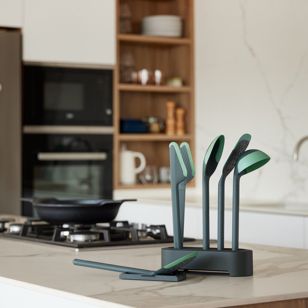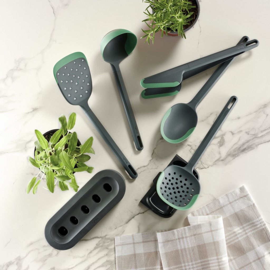 Kiedy gotujesz częściej, okazuje się, że problemem nie jest przepis, ale logistyka: przerzucanie, nabieranie, odcedzanie, mieszanie i nie niszczenie nieprzywierającej powierzchni. Tutaj masz pięć elementów, które obejmują typowe sytuacje kuchenne, ładnie stoją razem w jednym stojaku, a ich delikatne silikonowe części chronią naczynia i nastrój.