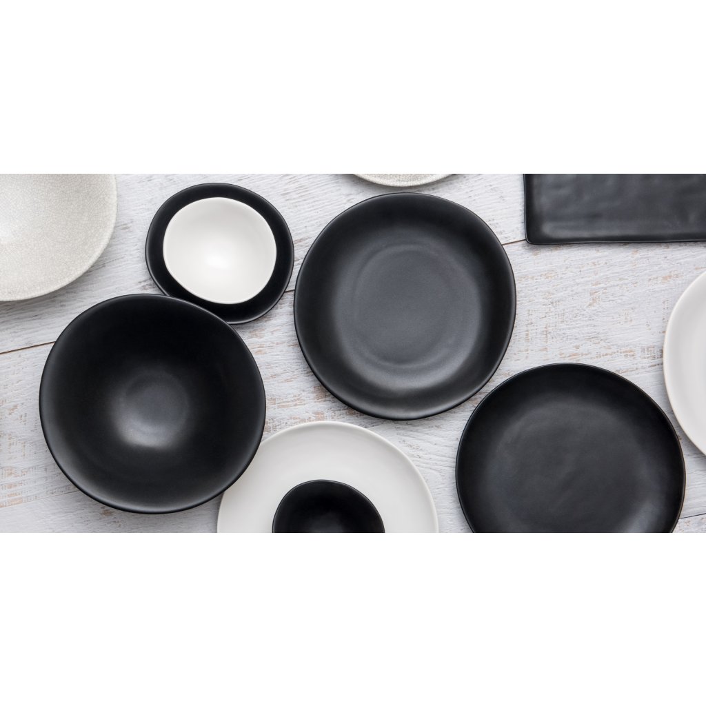 Kolekcja Modern charakteryzuje się minimalistycznym wzornictwem, głównie w kolorach czarnym i białym. Oprócz pięknej błyszczącej glazury, na naczyniach z tej serii nie znajdziesz żadnych wzorów ani dekoracji. Nacisk kładziony jest na ciekawe kształty wykonane ręcznie z ceramiki oraz czystość kolorów. Ta mała miseczka została celowo zgnieciona i zdeformowana podczas produkcji, aby przełamać stereotyp nudnych, zwykłych naczyń typowych dla Europy. Dlatego z pewnością zauważysz tę miskę, a Twoi znajomi będą Ci jej zazdrościć.