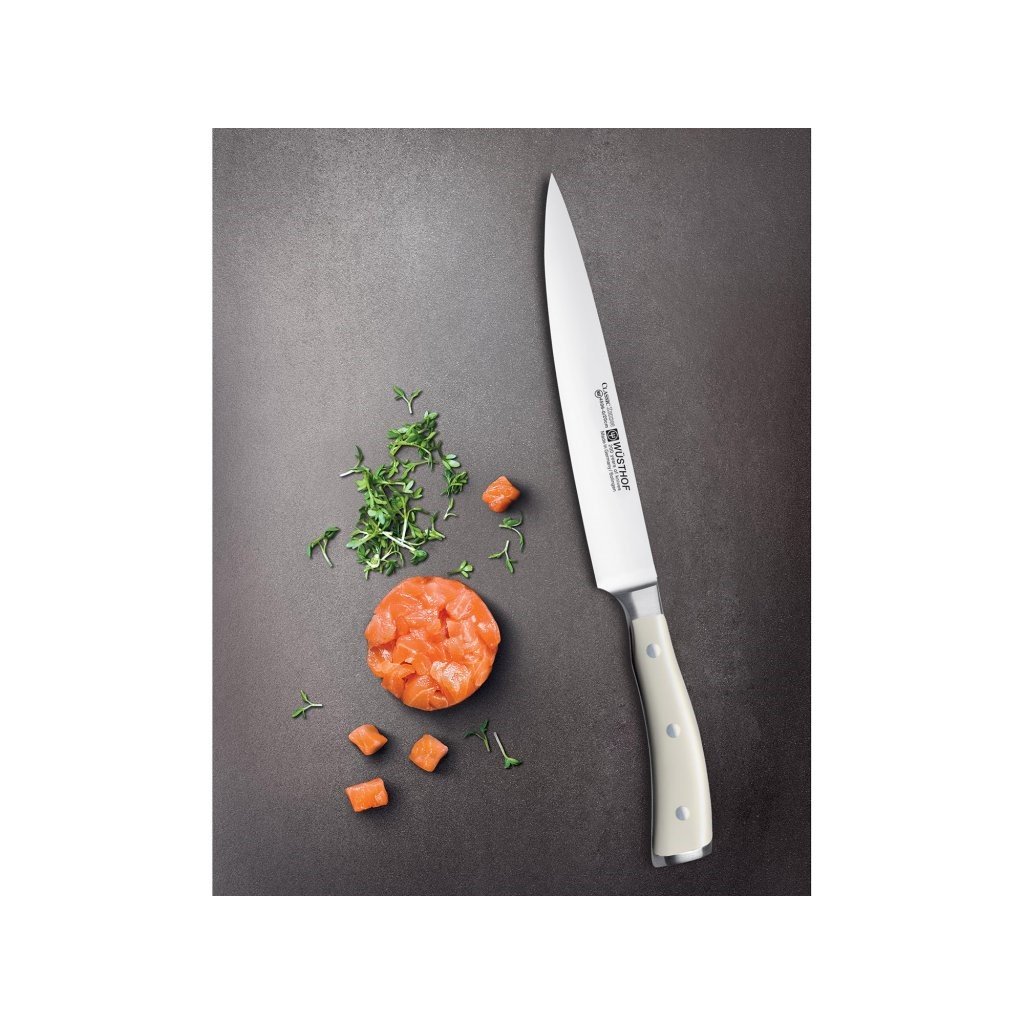 Nóż do mięsa Classic Ikon crème to smukły nóż z mocnym, długim ostrzem i delikatną krawędzią. Nadaje się do przygotowywania wszystkich rodzajów mięsa oraz do porcjowania pieczeni.