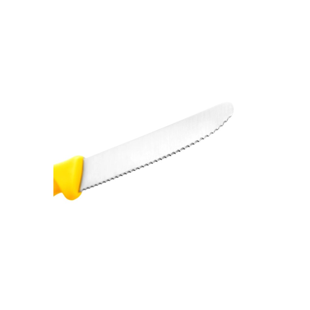 Idealny do wszystkich małych prac związanych z krojeniem w kuchni: do krojenia pomidorów, warzyw i owoców z twardą skórką. Ten wszechstronny nóż pokazuje swoje mocne strony podczas pracy z kiełbasą, bułkami i serem.