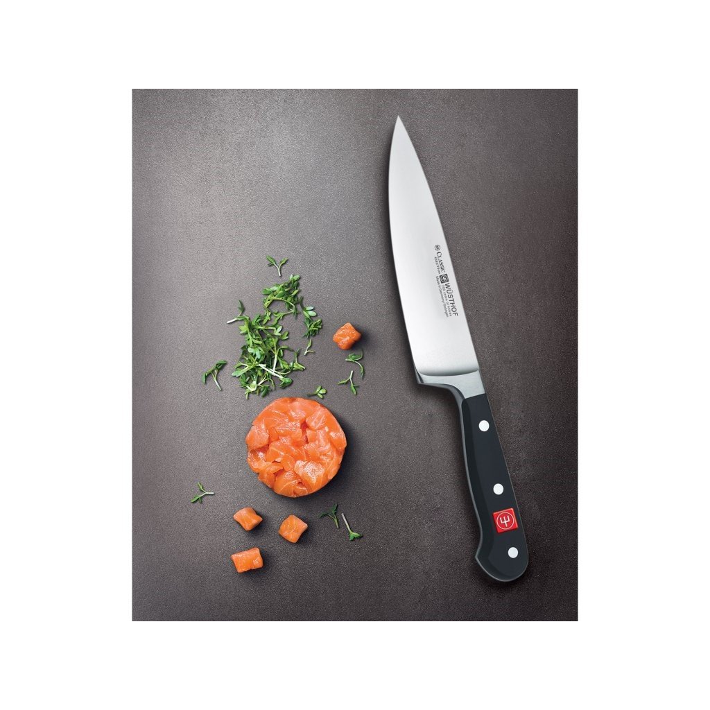 Nóż szefa kuchni Classic to solidny, ciężki nóż z szerokim ostrzem o cienkiej, ale wytrzymałej krawędzi. Wszechstronne urządzenie dla profesjonalistów i kucharzy hobbystów, którym oczyścisz warzywa, ale także posiekasz zioła lub kotlety.