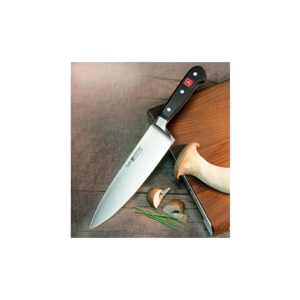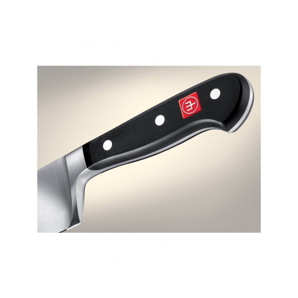 Seria noży Classic doskonale prezentuje sztukę wytwarzania noży firmy WÜSTHOF. Jest to najbardziej popularna seria w ofercie WÜSTHOF i to nie tylko ze względu na wysoki komfort użytkowania. Są to klasyczne noże z nitowanymi rękojeściami, których ostrza wykute są z jednego kawałka stopu stali nierdzewnej X50CrMoV15. Dzięki zastosowaniu wysokiej jakości materiałów oraz precyzyjnemu szlifowi, charakteryzuje się wysoką i długotrwałą ostrością. Wysoce funkcjonalne noże Classic są wykonane z wielką starannością, aż do ostatniego detalu. Dokładnie tak, jak się tego oczekuje od noży Solingen. Po pierwszym użyciu, nie będziesz chciał innego noża..