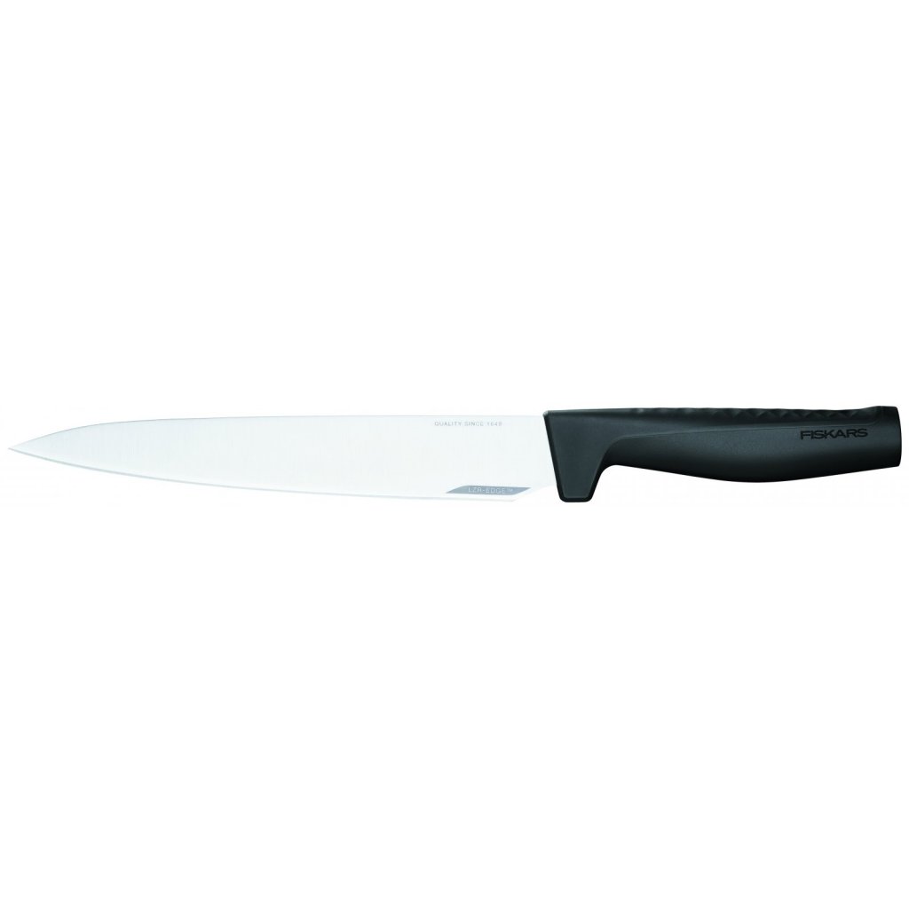 Nóż Hard Edge z długim prostym ostrzem oraz gładką krawędzią jest używany do krojenia większych kawałków mięsa, ale także do krojenia surowego i pieczonego mięsa. Można go używać do krojenia szynki, salami i innych wędlin, ale można nim również kroić melona lub ananasa. Solidne i doskonale ostre ostrze noża do porcjowania Hard Edge Fiskars ma 22 cm długości i stosunkowo dużą szerokość. Ostrze wykonane z wysokiej jakości twardej stali nierdzewnej pozostaje ostre przez długi czas dzięki specjalnej technologii ostrzenia LZR-EDGE™.