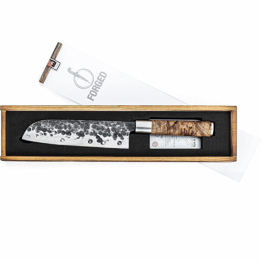 - nóż japoński Santoku Forged VG10 z ostrzem 18 cm to wszechstronny pomocnik kuchenny, który łączy precyzyjne cięcie z wyważoną konstrukcją i maksymalną wydajnością