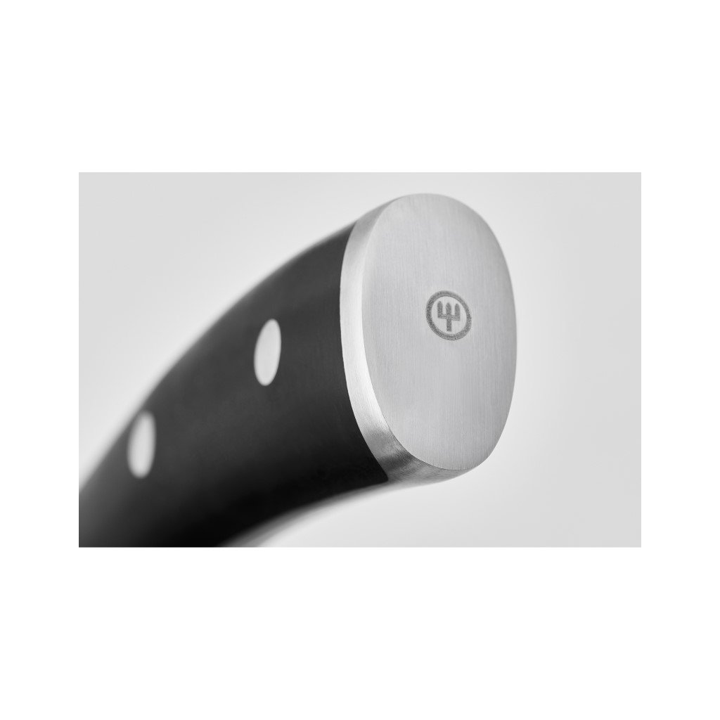 Rękojeść noża Classic Ikon wykonana jest z wytrzymałego materiału syntetycznego w kolorze czarnym. Spełnia wymagania pod względem ergonomii, a pod względem estetycznym z wyczuciem łączy nowoczesny design z typowym wyglądem rękojeści z trzema nitami. Wytrzymały materiał rękojeści jest odporny na mycie w zmywarce, ale zalecamy mycie ręczne, aby zachować jakość ostrza, co jest preferowane w przypadku noży wysokiej jakości.