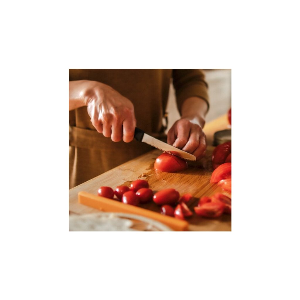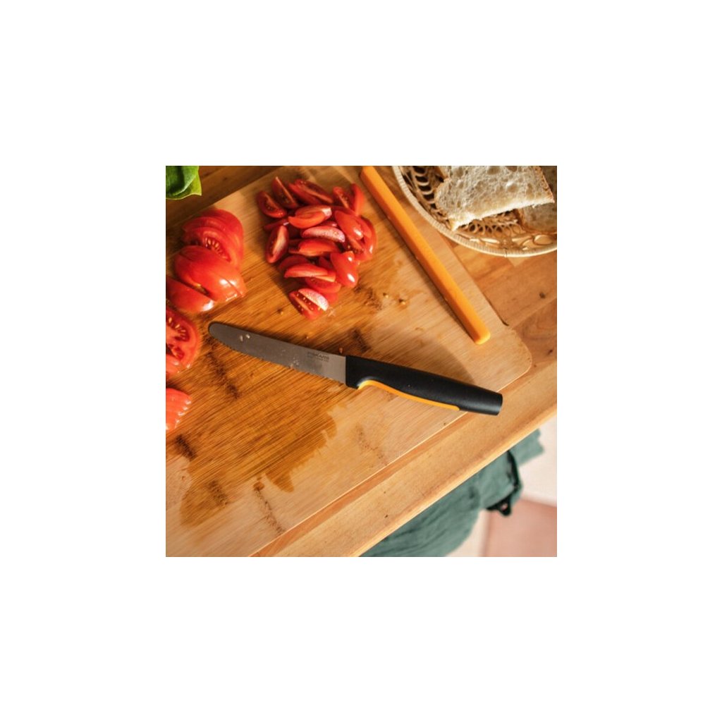Dla szefa kuchni, który ceni elegancko zaprojektowane, łatwe w utrzymaniu narzędzia kuchenne. Nóż śniadaniowy Fiskars Functional Form™ jest niezbędny do łatwego przygotowywania i spożywania posiłków. Jest to średniej wielkości nóż z ząbkami na mocnej głowni wykonany z japońskiej stali nierdzewnej. Jest idealny do krojenia żywności z twardą skórką, takich jak chleb lub pomidory.