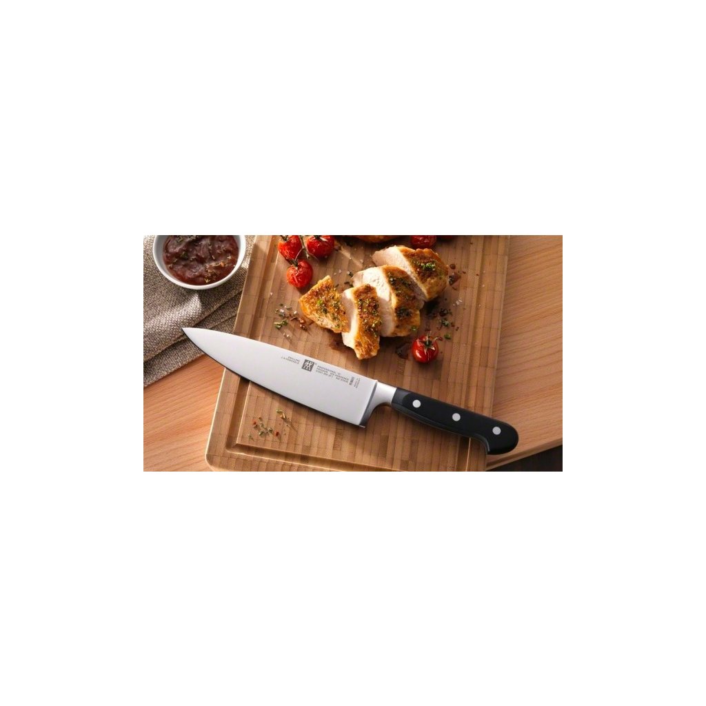 Nóż szefa kuchni z kolekcji Professional "S" marki Zwilling posiada długie, szerokie ostrze o długości 23 cm, które jest centralnie wyśrodkowane. Nóż ten jest wszechstronnym narzędziem do krojenia dużych kawałków owoców, warzyw, mięsa, ryb, siekania ziół itp. Dzięki solidnemu i szerokiemu ostrzu z cienką krawędzią, siła jest równomiernie rozłożona podczas krojenia i można skutecznie kontrolować cięcie. Profesjonalna seria "S" jest ulubieńcem szefów kuchni ze względu na nienaganną jakość, konstrukcję z trzema solidnymi nitami i pełnym trzpieniem. Nóż jest kuty z jednego kawałka stali, dzięki czemu jest bez spawów i bez łączeń. Jest doskonale wyważony , bezpieczny i łatwy w użyciu. Nóż posiada długotrwałą ostrość, którą łatwo przywrócić dzięki ręcznemu ostrzeniu, polerowaniu i kontroli laserowej.