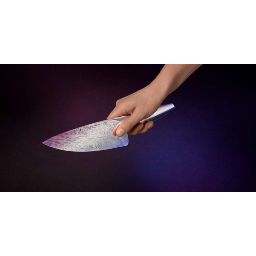 Nóż szefa kuchni Chef's Edition Damasteel jest idealny do krojenia i obierania warzyw, mięsa, ziół i orzechów. Nóż ma jedną stronę szerszą, co umożliwia równomierne filetowanie ryb. Jest odpowiedni dla profesjonalnych kucharzy, ale także dla amatorów.