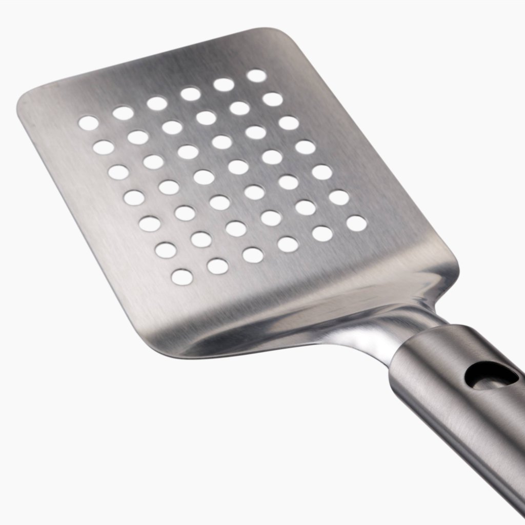 - Szeroka perforowana powierzchnia umożliwia wygodne podnoszenie większych kawałków żywności i zapewnia stabilność podczas manipulowania na rozgrzanym ruszcie.