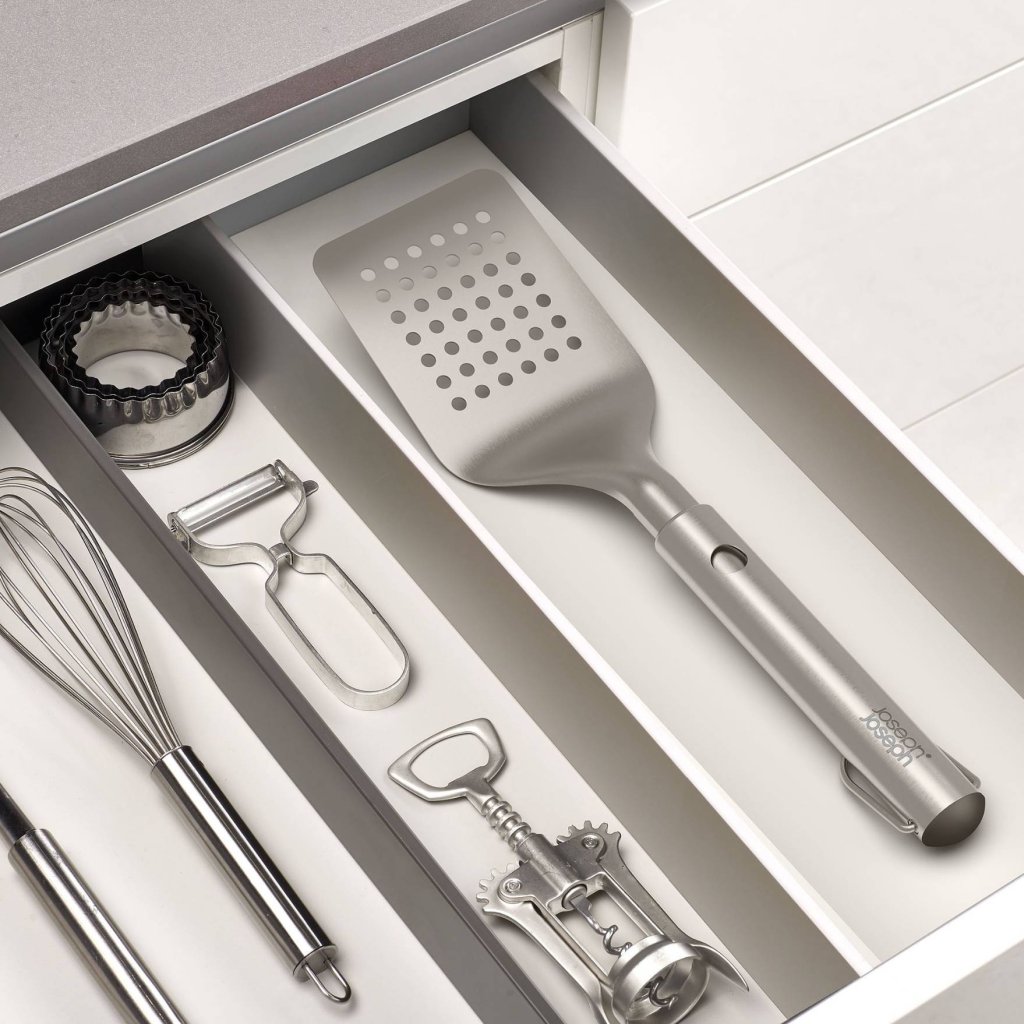 - Wysuwany uchwyt umożliwia przedłużenie podczas użytkowania, a następnie schowanie dla oszczędności miejsca podczas przechowywania w kuchni.