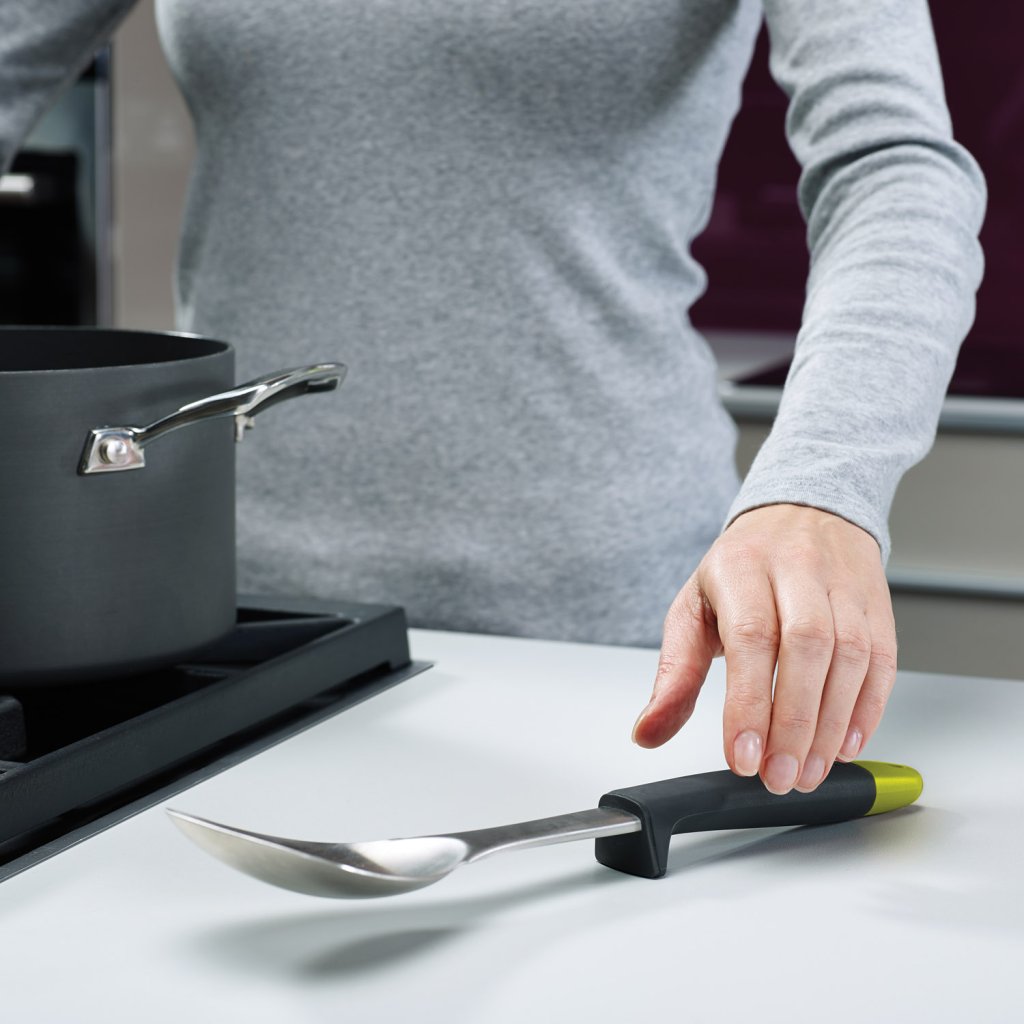 Jak i gdzie odłożyć chochlę, łopatkę do obracania i inne przybory kuchenne to odwieczne pytanie. Podczas szybkiej pracy w kuchni idealnym miejscem jest blat roboczy. Tym razem projektanci pracowali tylko nad małym detalem, ale w efekcie otrzymali znaczące rozwiązanie. Pochylony uchwyt znajdujący się na zintegrowanej podpórce zapewni, że część przyboru przeznaczona do pracy będzie miała zawsze swoje miejsce nad blatem roboczym.