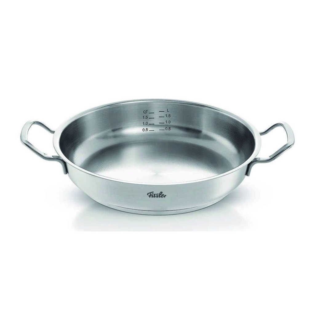 Patelnia do serwowania z serii Pure-Profi Collection marki Fissler ma średnicę 28 cm i pojemność 3 l. Wykonana jest z wysokiej jakości stali nierdzewnej 18/10. Nadaje się do wszystkich rodzajów kuchenek, w tym indukcyjnych i można ją myć w zmywarce.