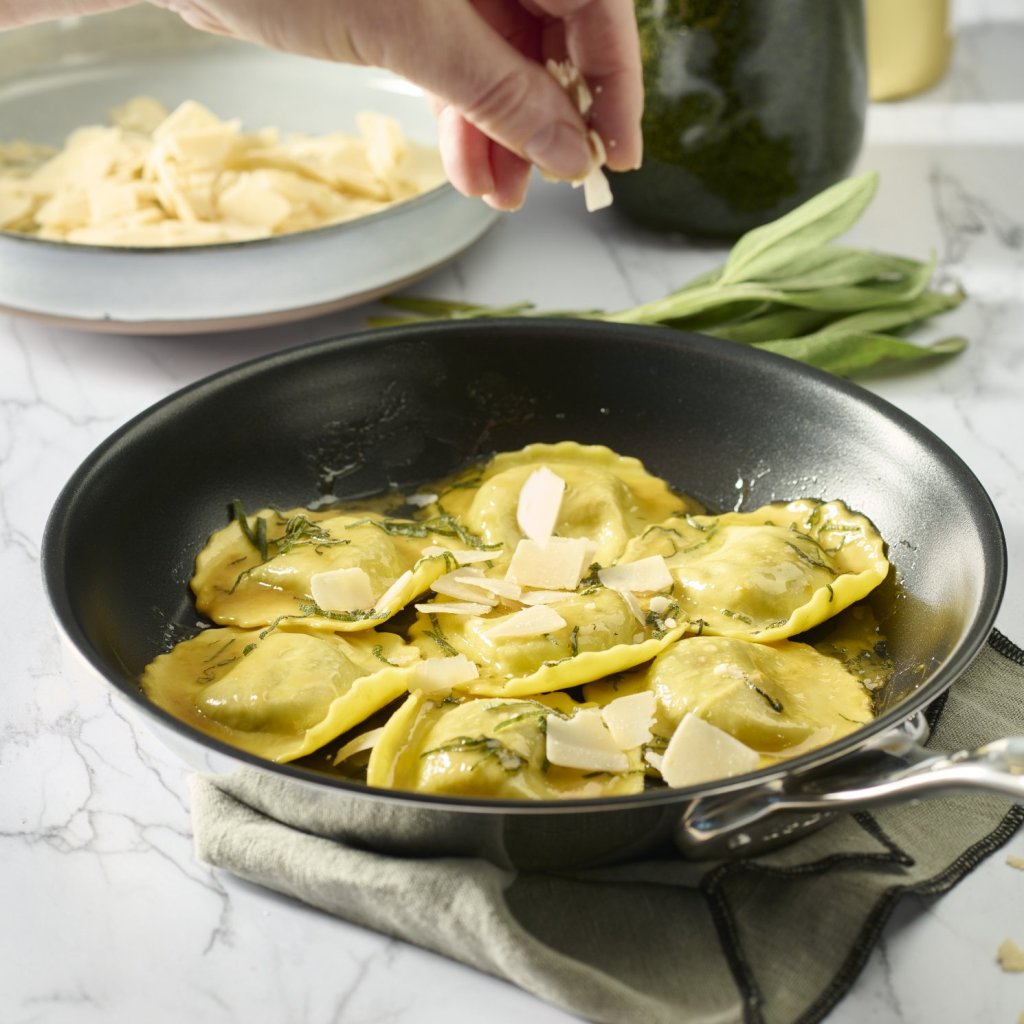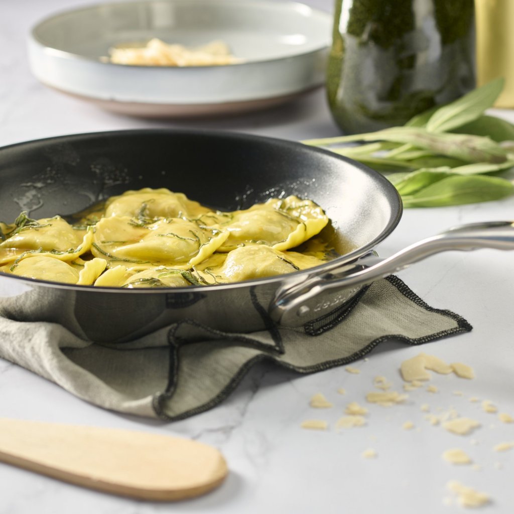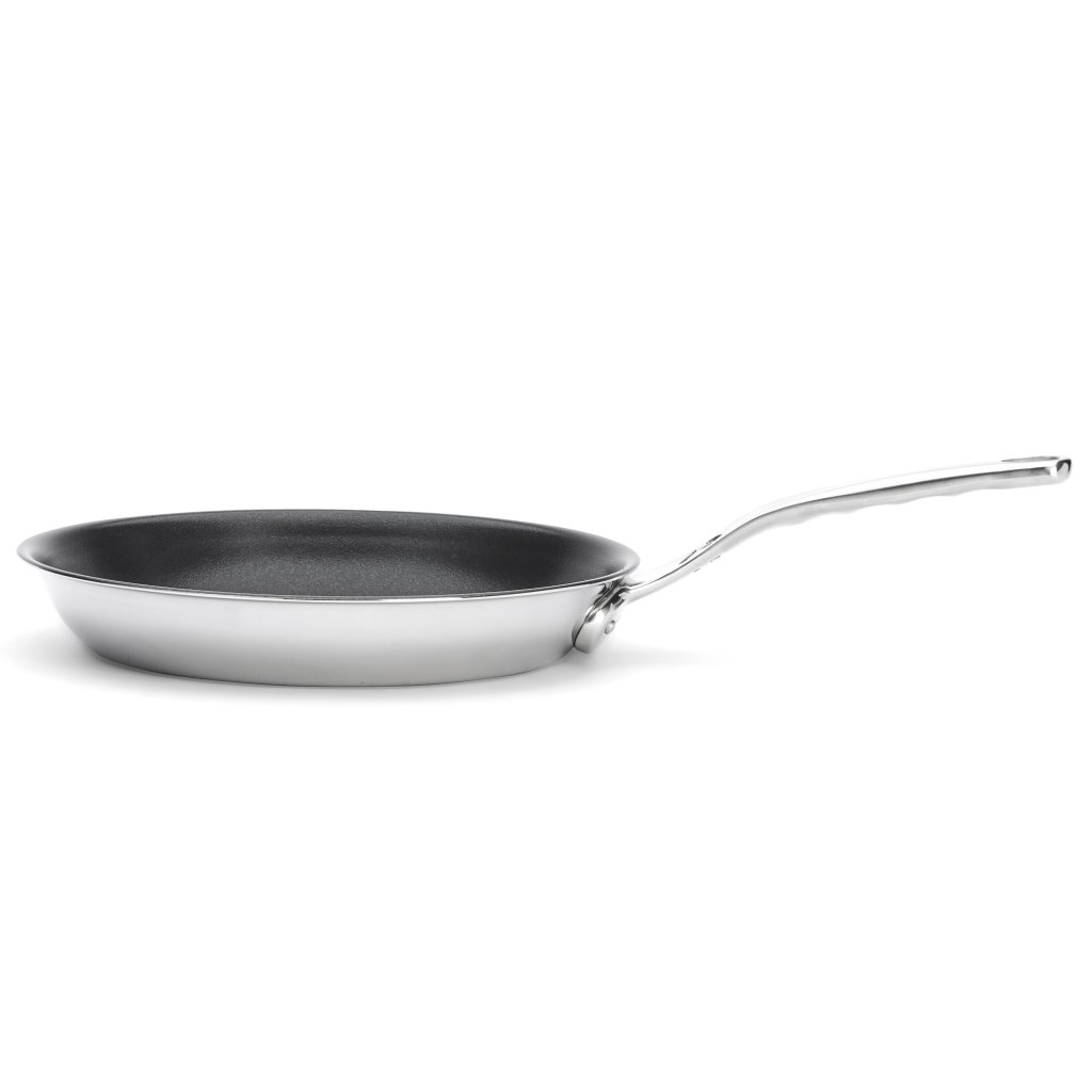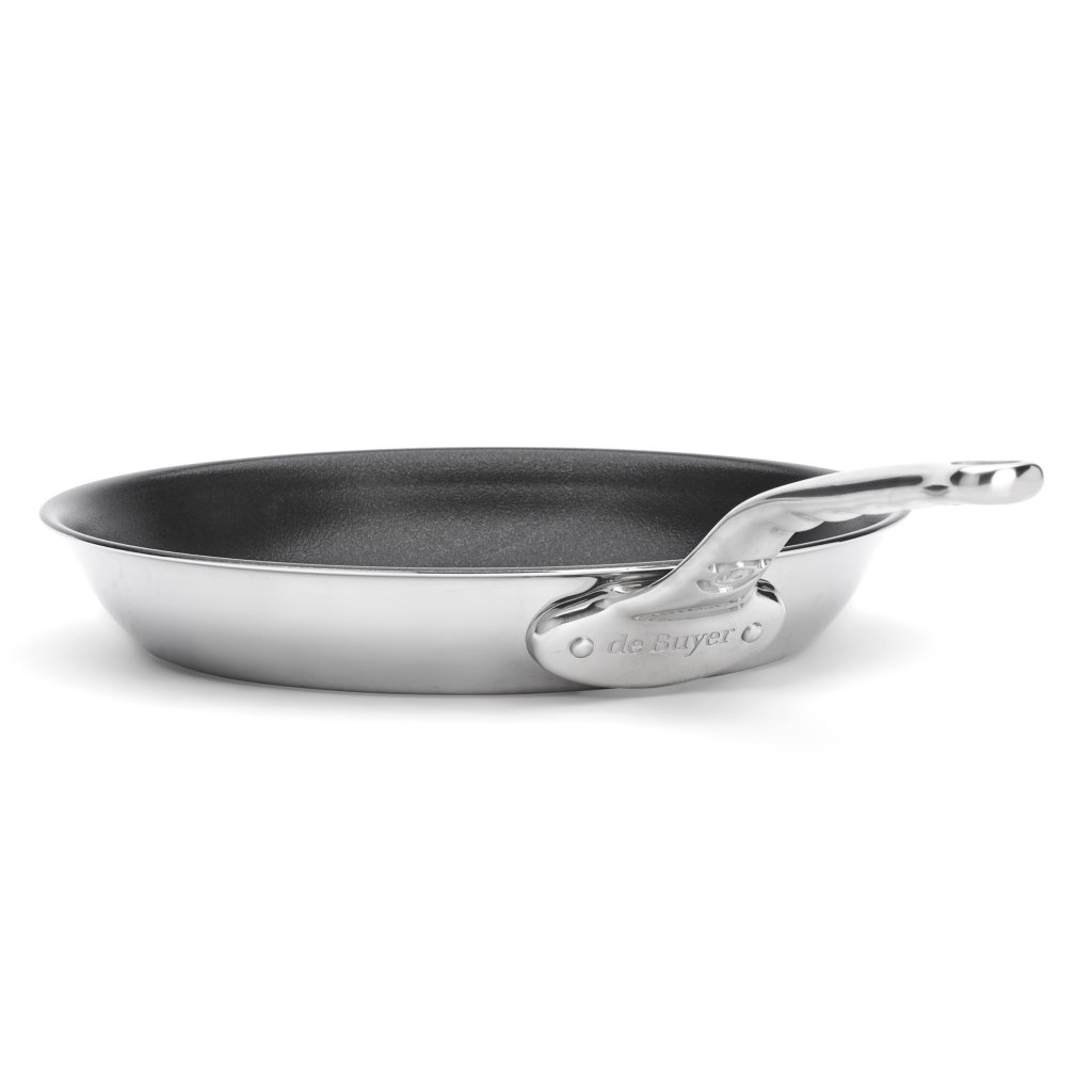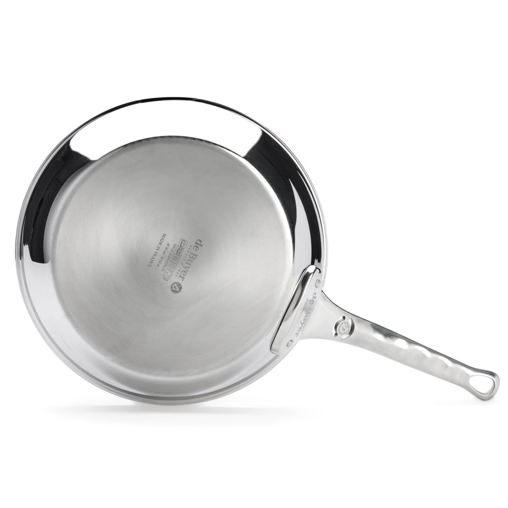 - stal nierdzewna patelnia z nieprzywierającą powłoką de Buyer AFFINITY o średnicy 32 cm idealnie nadaje się do delikatnego gotowania bez przypalania i łatwego serwowania potraw