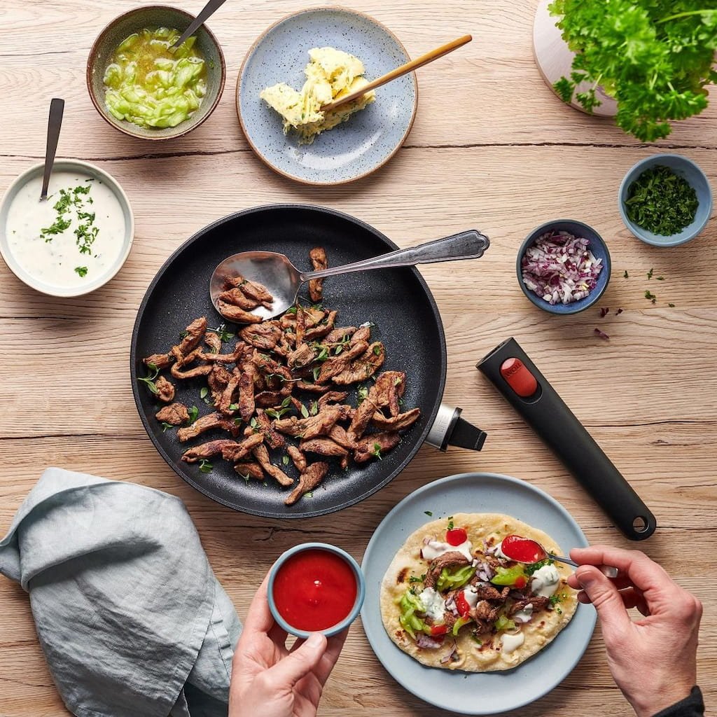 - zdejmowany uchwyt umożliwia łatwe przechowywanie, mycie w zmywarce i używanie w piekarniku do 300 °C bez uchwytu