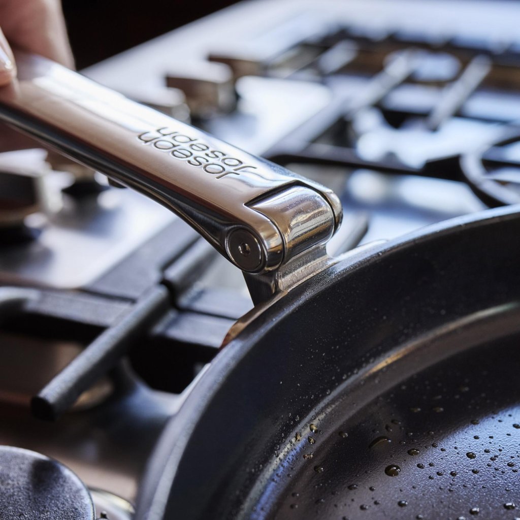 - Mechanizm składania umożliwia sztaplowanie patelni z tej samej serii w szufladach lub szafkach, oszczędzając do 50% miejsca.