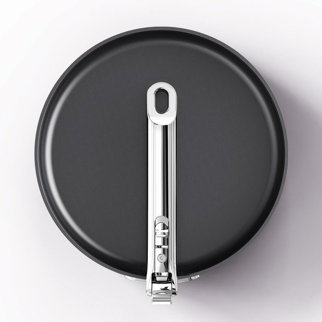 - Mechanizm składania umożliwia sztaplowanie patelni z tej samej serii w szufladach lub szafkach, oszczędzając do 50% miejsca.