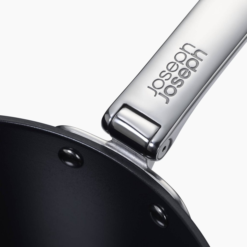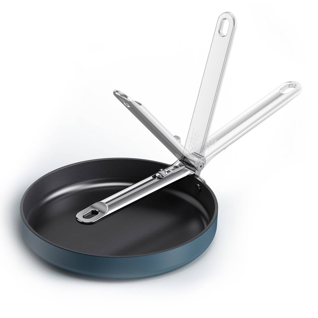 - Dzięki mechanizmowi składania patelnię można łatwo układać w stos z innymi naczyniami, co znacznie ułatwia organizację przestrzeni kuchennej.