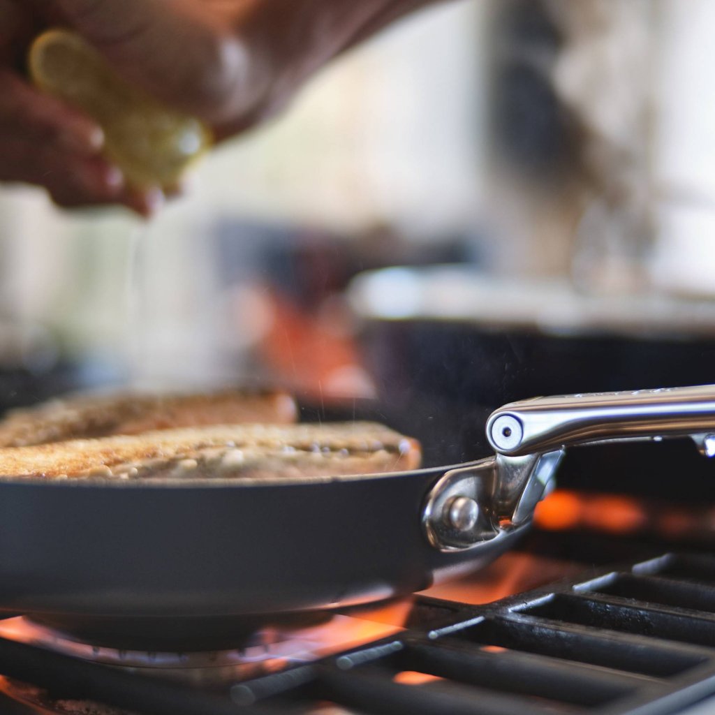 - Ciężki aluminiowy korpus zapewnia równomierne rozprowadzanie ciepła po całej powierzchni patelni i przyczynia się do doskonałych rezultatów gotowania.