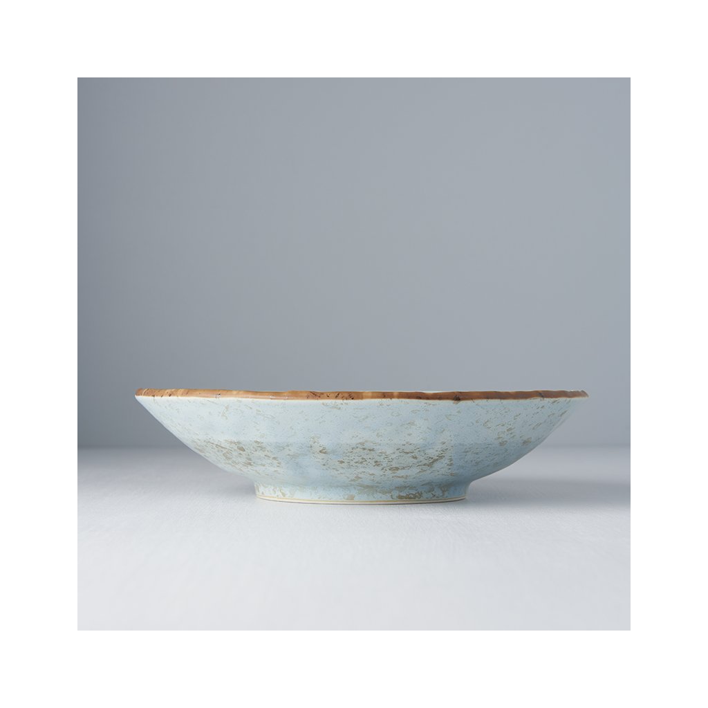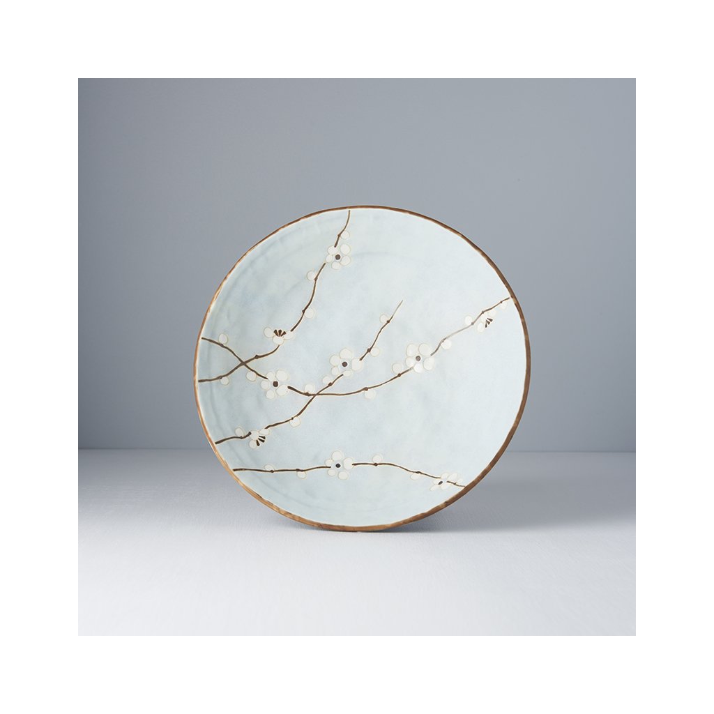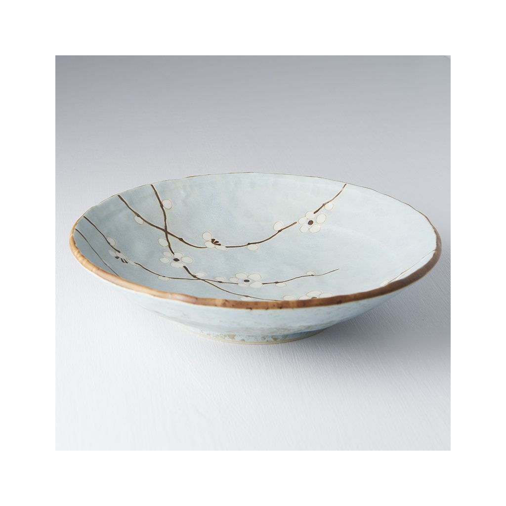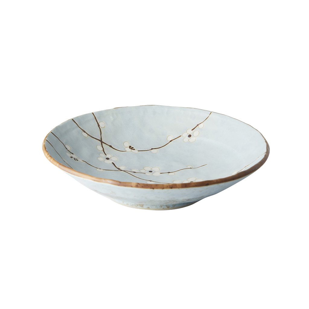 Ta płytka misa jest inspirowana tradycyjnymi japońskimi malowidłami z dawnych wieków. Na jasnoniebieskim znajdują się białe japońskie kwiaty wiśni, wywołujące poczucie spokoju i pokoju. Brązowawy brzeg misy tylko dodaje wrażenia starożytności, gdyż wygląda to tak, jakby misa była używana przez setki lat, a farba wytarła się na brzegu.
