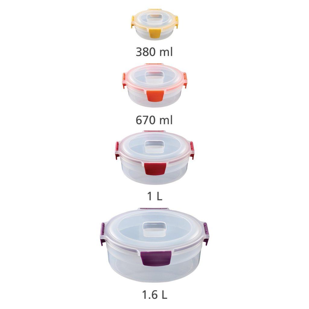 - Zestaw zawiera cztery okrągłe pojemniki o pojemności 380 ml, 670 ml, 1 litr i 1,6 litra z odpowiednimi pokrywkami, które pokryją szerokie spektrum potrzeb.